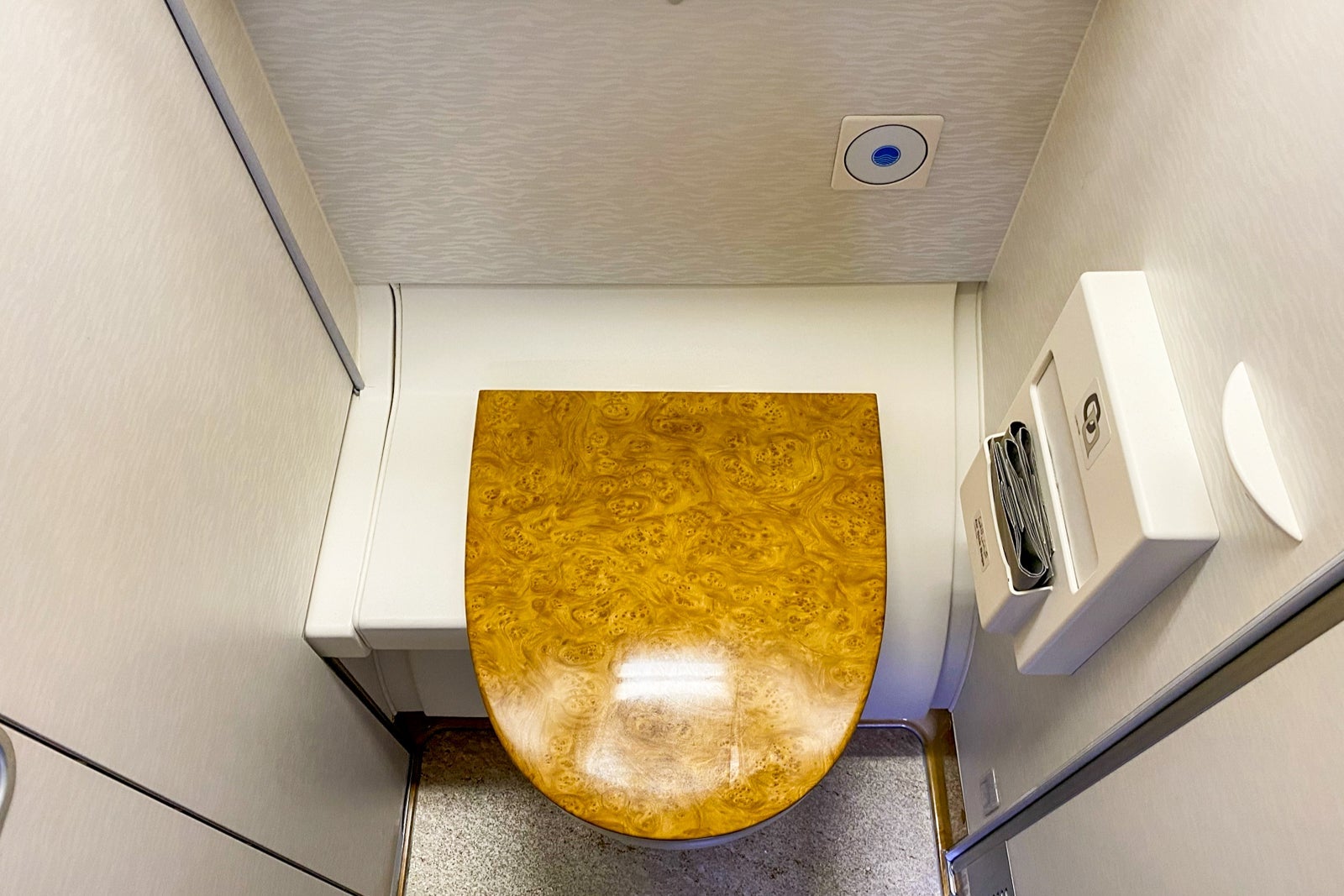 Everything. Is. Gold. The cabin wall is golden burled wood. The business-class seats are decked out in gold. Even the toilet seat is gold-hued.