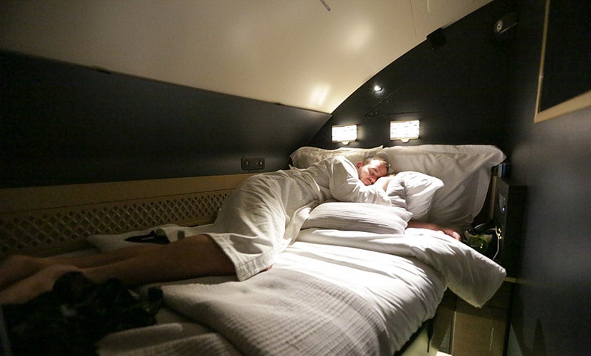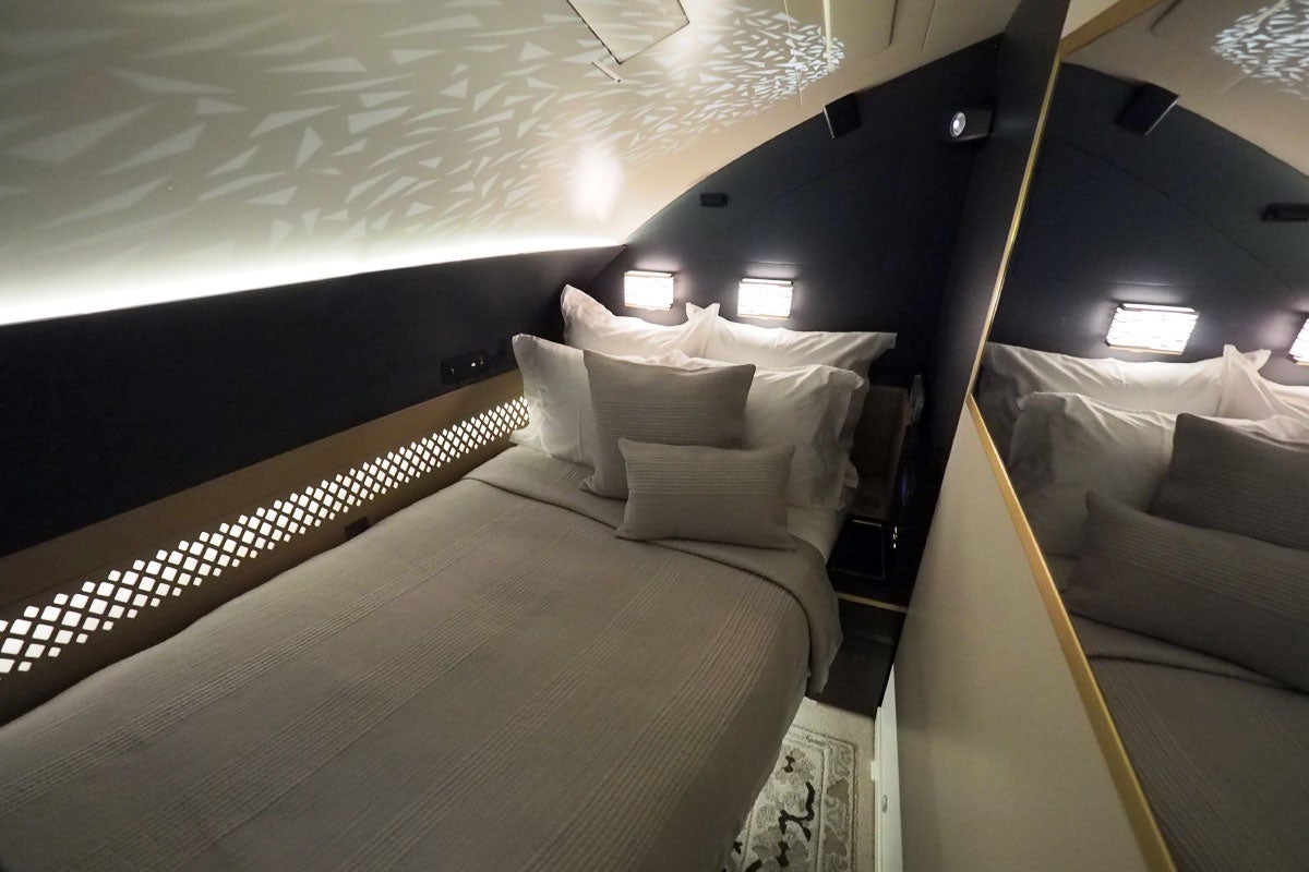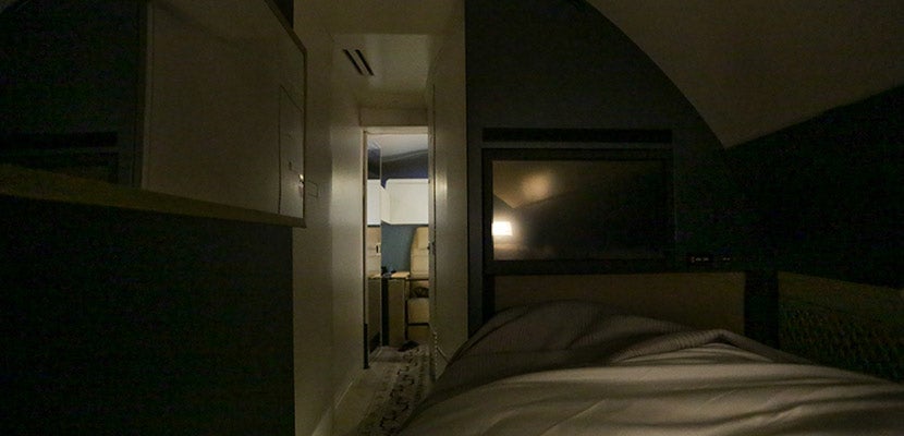 The ceiling of the bedroom, like the bathroom, is on a slant that can be somewhat dangerous if you're not looking and prepared to duck. Whereas in The Apartment suites, there isn't a separate bed(room), The Residence has its own dedicated room with a real double mattress. I was so delighted when I was finally able to lay down on the bed that I nearly forgot I was 35,000 feet in the air. The mattress itself was so comfortable that I felt like I could have been in a luxury hotel. It was big enough for my 6'7" frame to stretch out, and I slept like a baby for my four-hour nap.