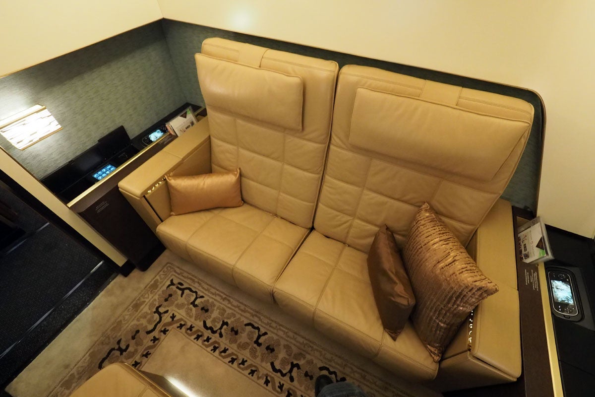 The door to The Residence leads to the living room, which looks much like The Apartment. There's a two-seat couch made from nice European leather in either beige or brown, depending on the aircraft. I did, however, see a missed opportunity here for Etihad. I could see executives wanting to splurge for the Residence, but the only place to sleep is on the bed — the living room area only reclines a couple inches. I really think the airline should have given the option to have an additional bed in the living room area.