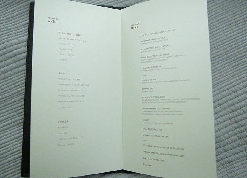 The Residence has a relatively wide and diverse menu for the flight. In addition to the standard entrées, there's also an "All Day Dine" menu, which has some lighter options available at any time throughout the journey. Some meal options include a rib-eye steak, chicken breast and rack of lamb, which can you can order with sides, such as creamy mashed potatoes or steamed green beans.