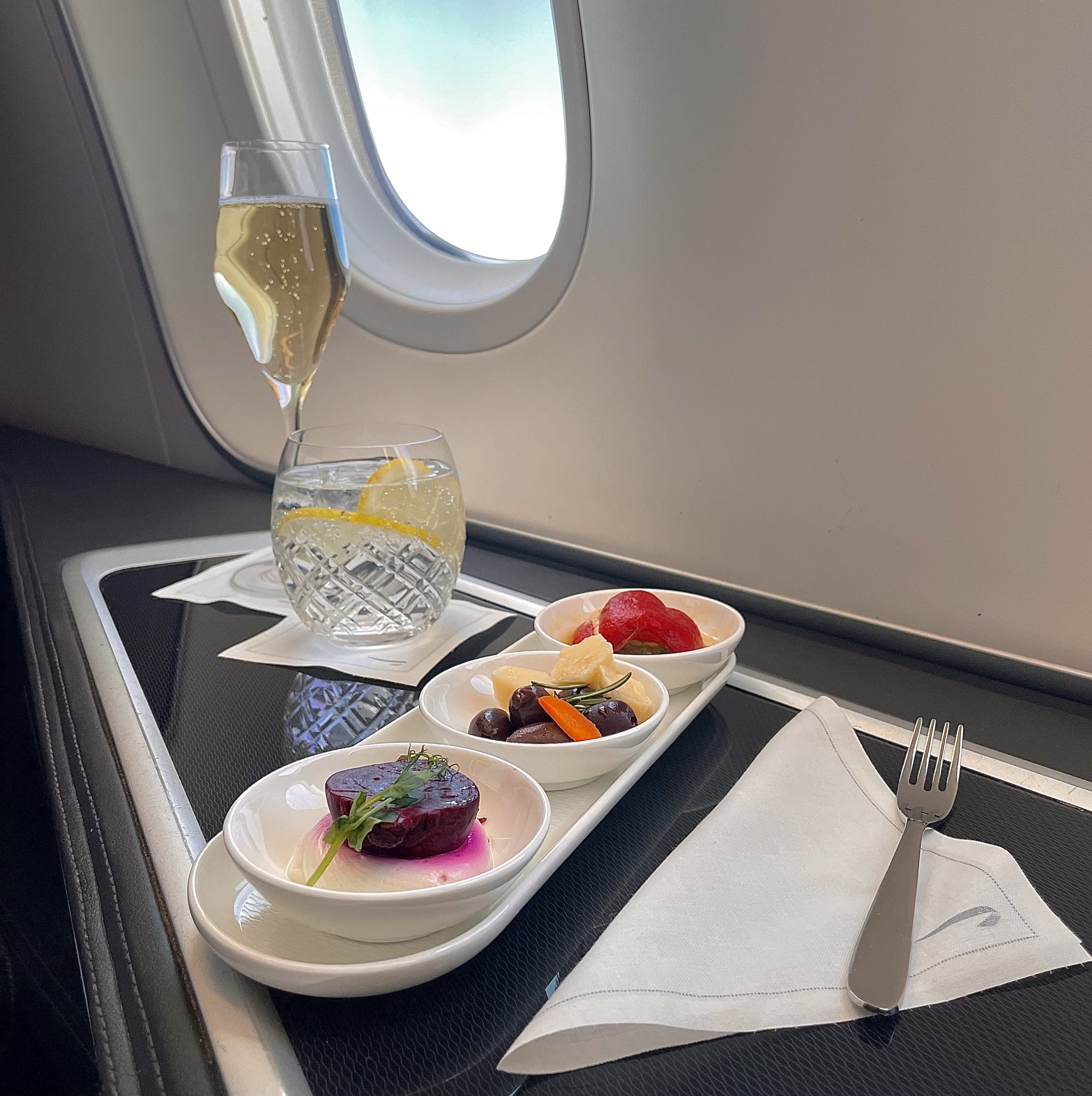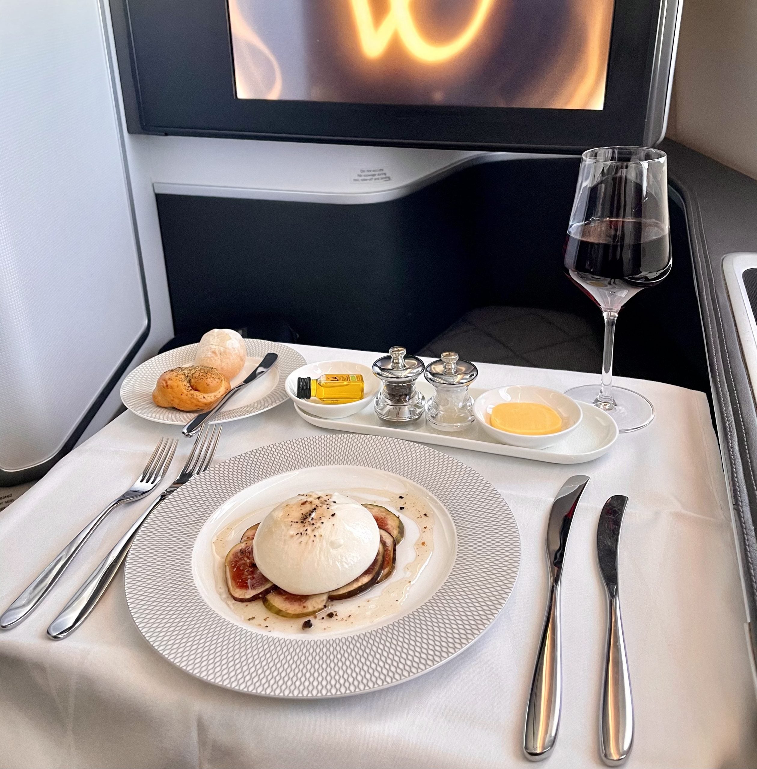I was immediately glad that I had splurged on the upgrade. Pandemic stories of cold meals served in cardboard boxes are a thing of the past. BA First is almost back to full service these days. Pyjamas, amenity kits and slippers were handed out after boarding and the menu was still slight reduced but almost back to its former glory.