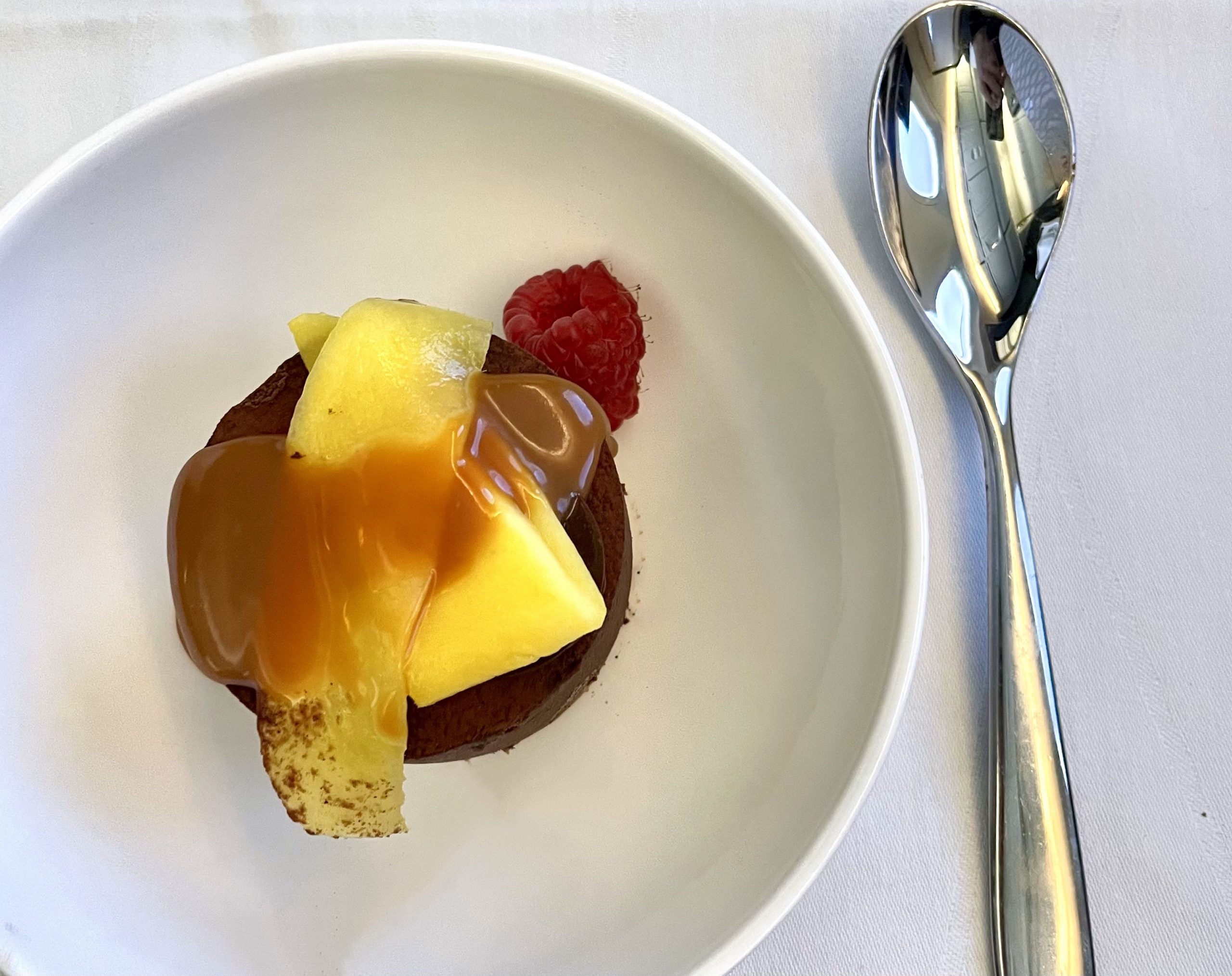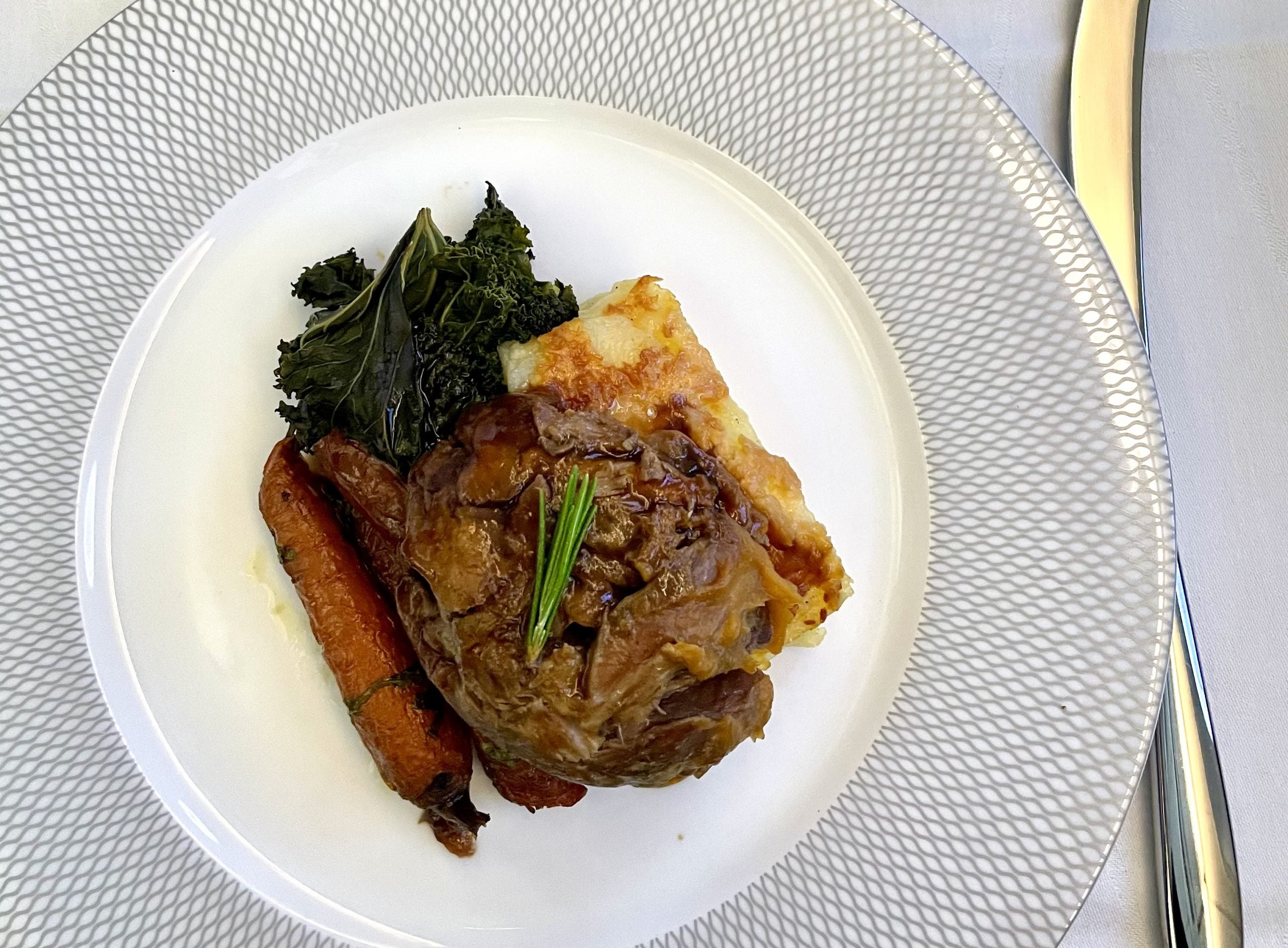 The food across the board, catered by the consistently good Do&Co was truly exceptional. First up was burrata with figs and truffle honey. The cheese was gooey and soft and matched perfectly with the fruit and truffle. Next was braised welsh lamb shank, pinched from Club World business class and plated up for me because they ran out of this popular dish in First. To finish, a barrage of desserts included a chocolate and salted caramel tower, a cheese board and a bowl of ice-cream, laden with fruit, meringue, chocolate pieces and chocolate sauce.