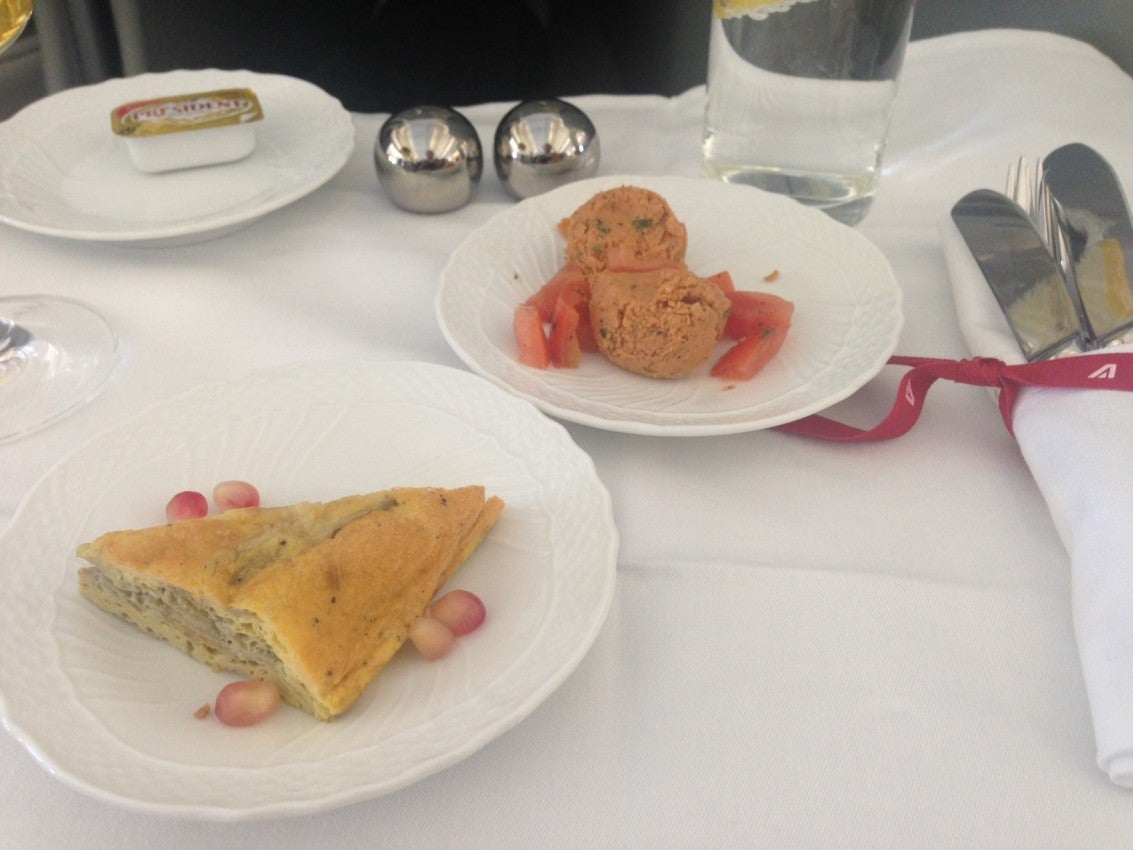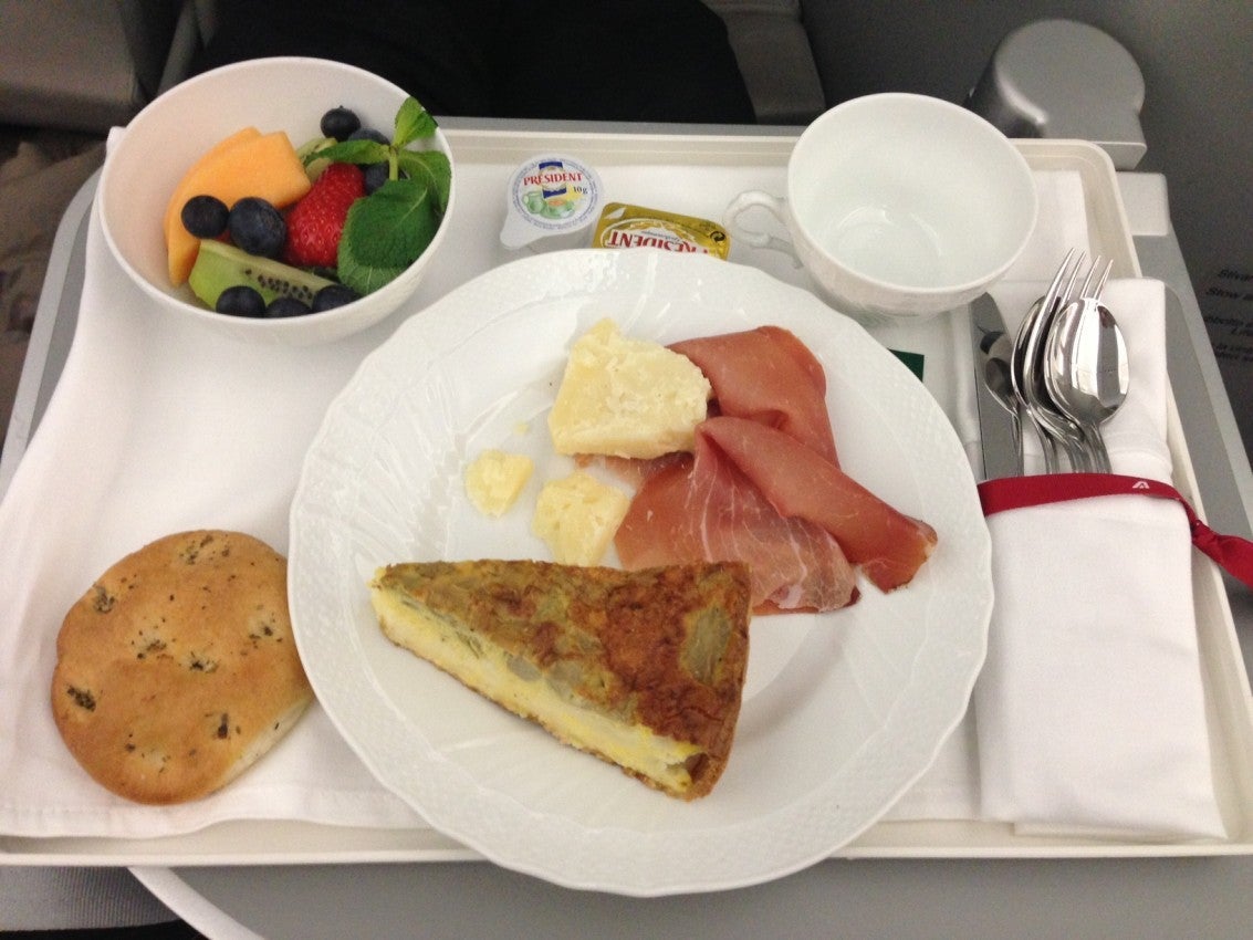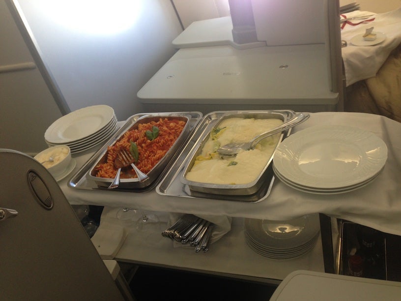Before stretching out in my lie-flat seat I wanted to enjoy a good meal. Lunch consisted of four courses with the option for a snack as well. In the past when I flew Alitalia business class, I thought the food was decent, though some courses were much better than others. Alitalia serves meals from carts where you can pick whatever you want to eat.