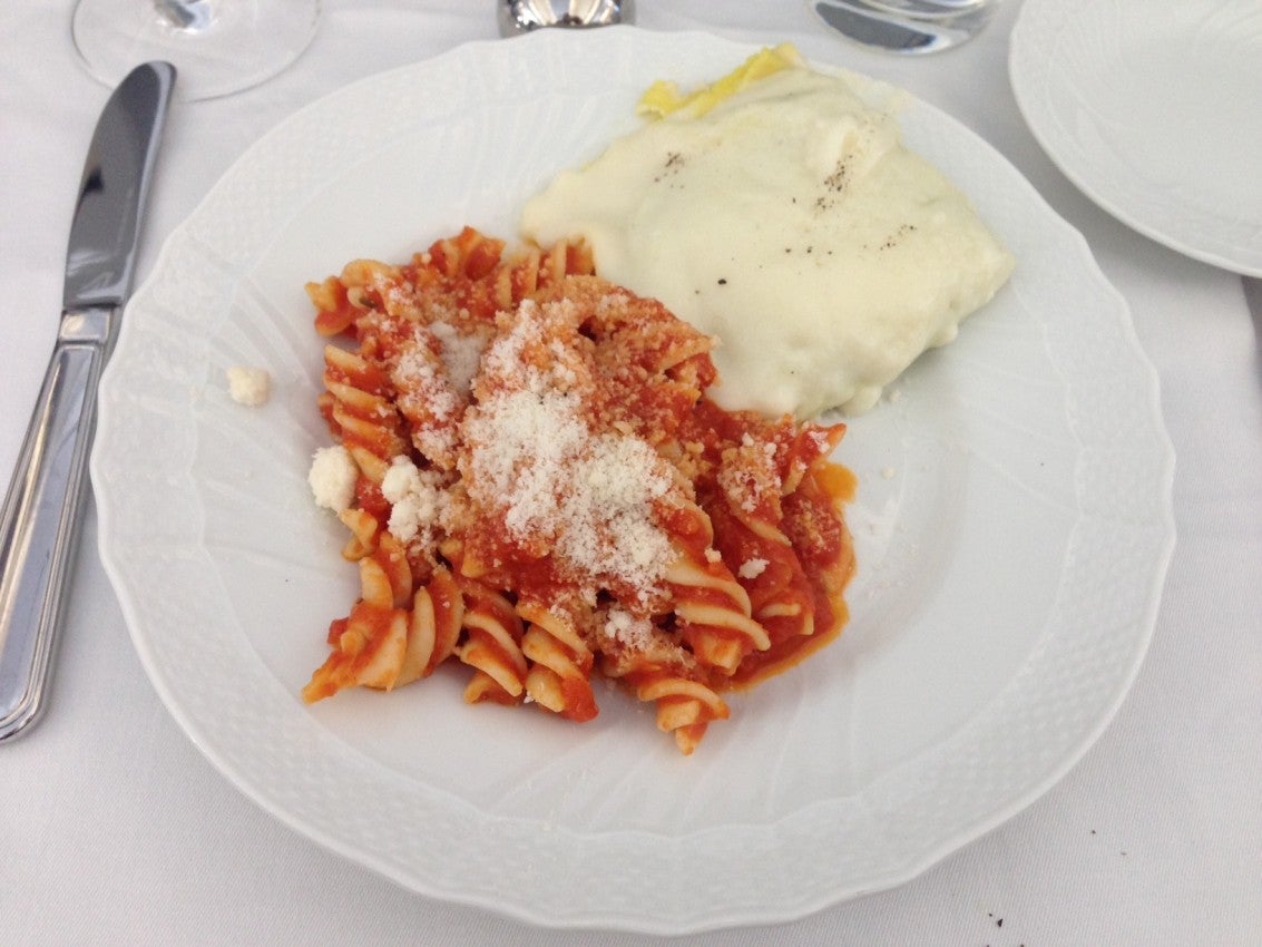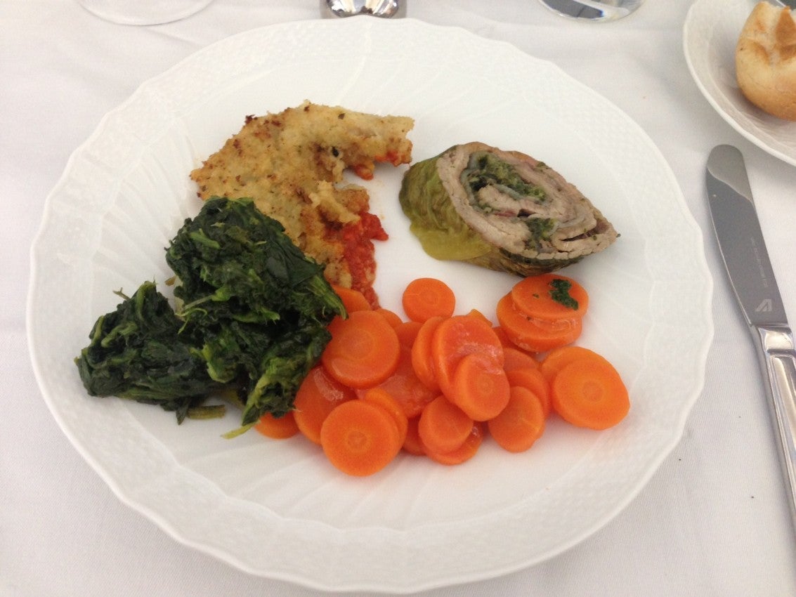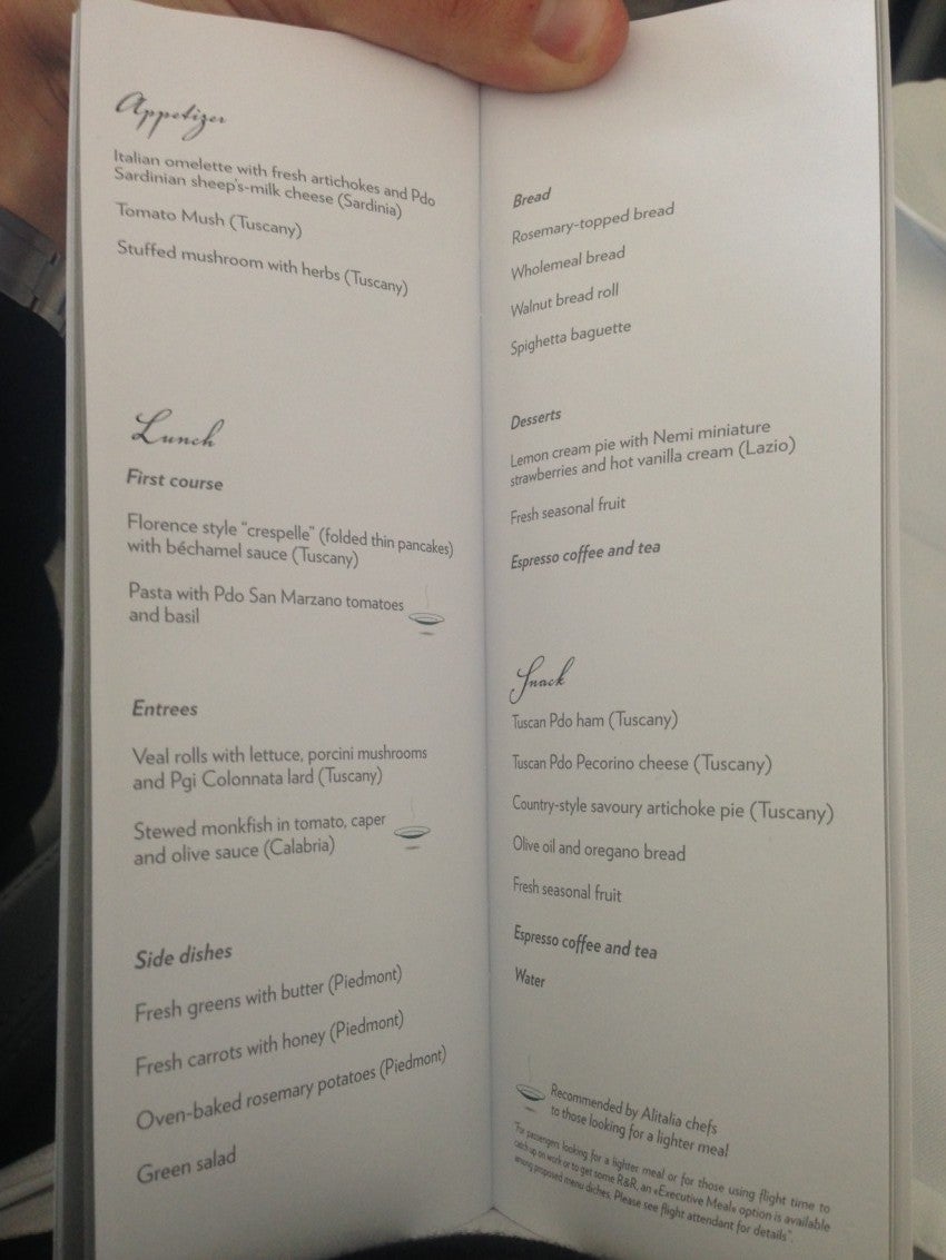 For my first course I ordered the pasta with San Marzano tomatoes and basil. While it wasn't nearly as delicious as some of the pasta I had when I was in Italy, I thought it was good for airplane standards. I also tried the creamy pasta - crespelle with Bechamel sauce - which was so rich I couldn't actually taste anything but pure fat. I passed on that to enjoy my calories elsewhere!