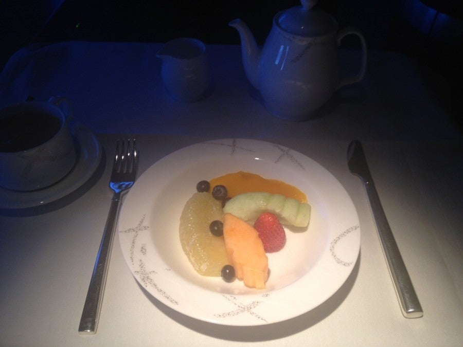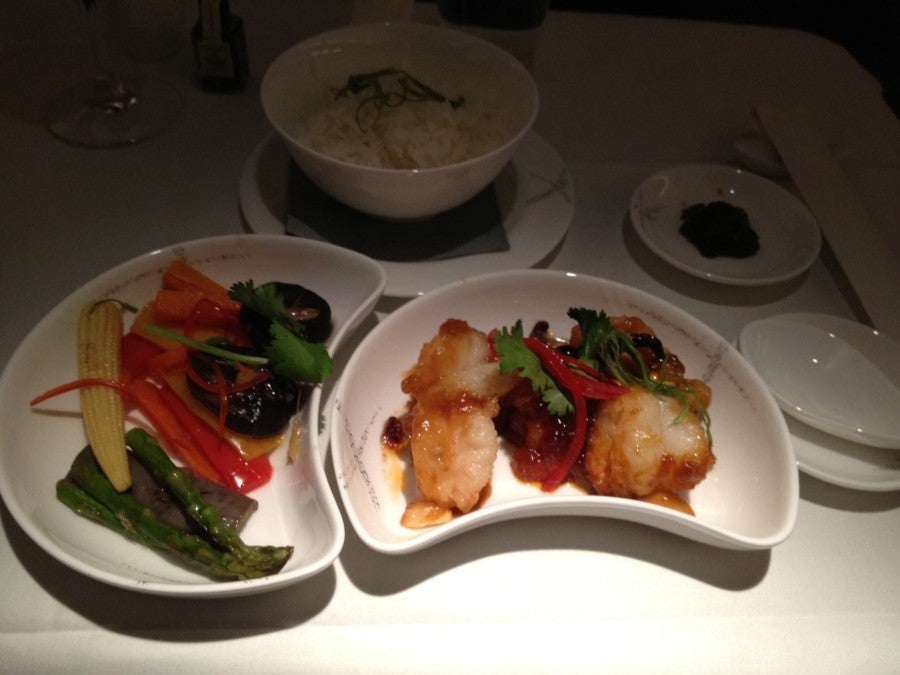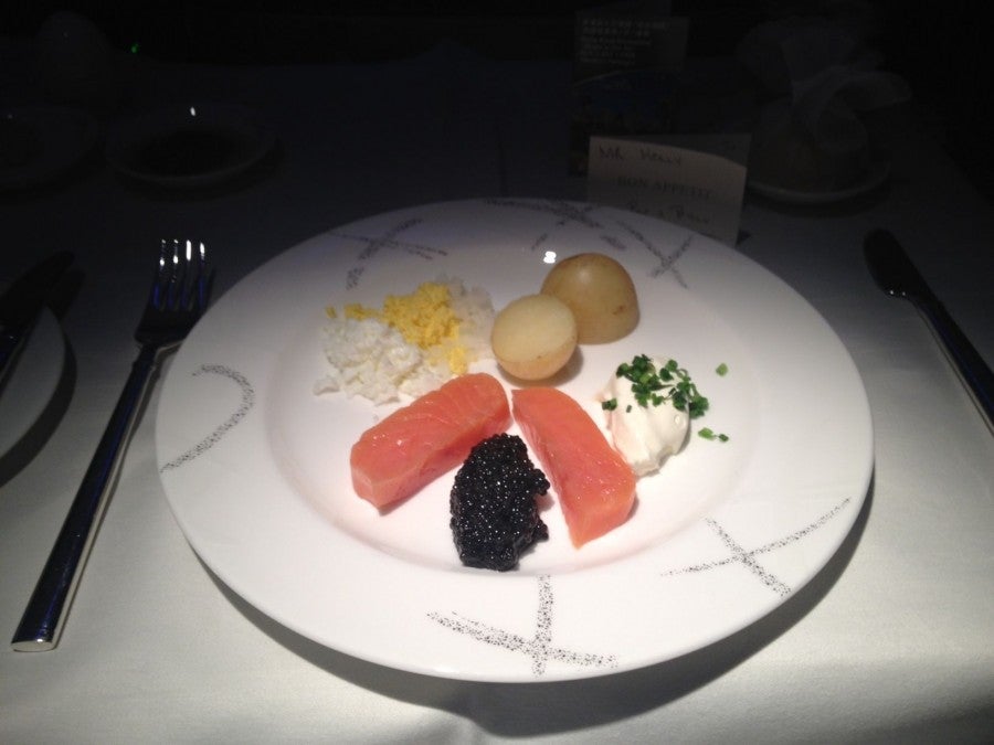 Though the flight took off after midnight and it was well into the night before meal service started, I stayed up just to experience the cuisine. It was pretty fancy - especially compared with US carriers, with dishes like smoked salmon and caviar, and a main of sea bass with assorted Asian veggies. The Asian options on both of my flights were light and good, so I was happy.