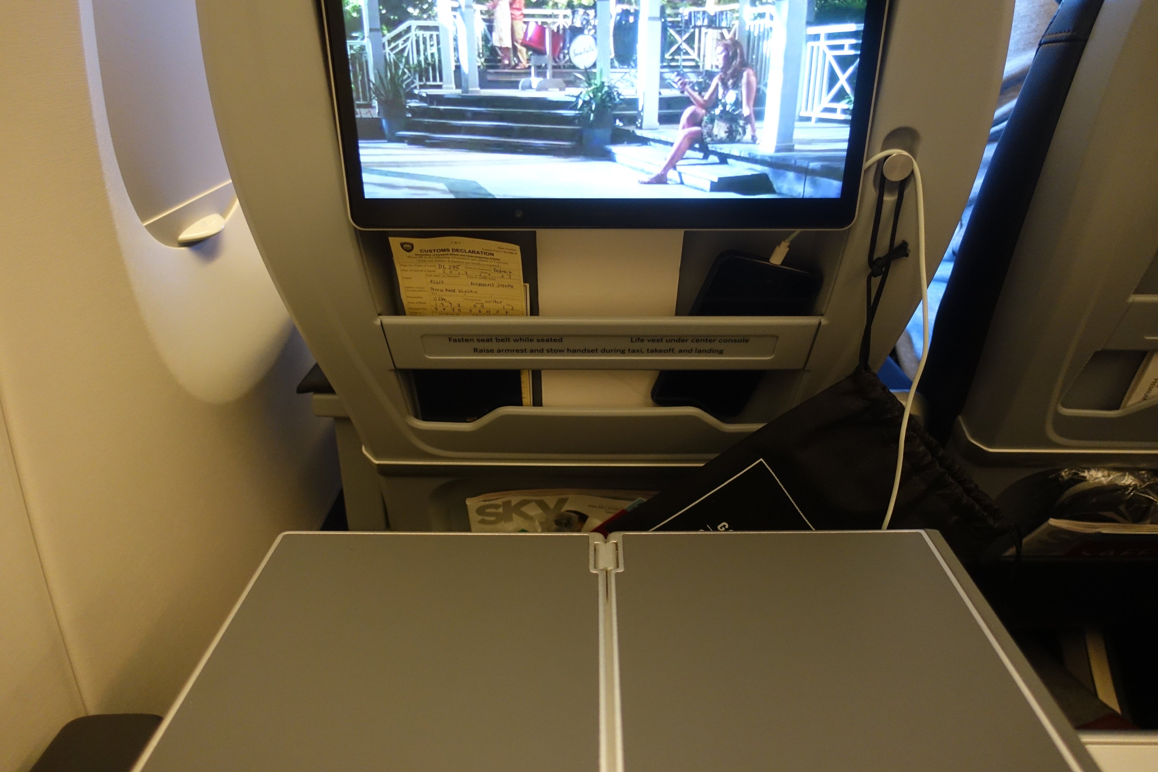 Each seat also had a remote to control the IFE, but I left it in its place the entire flight since the touchscreen was so responsive. Also, there are three seat control buttons — one to deploy the footrest, one to recline the seat, and another one to put the footrest back into position. The seatback in front of me also had an area that was useful for storing my phone, passport and customs/immigration cards. Next to that was a hook meant for a jacket, but I used it to hold the bag that the LSTN headphones came in.