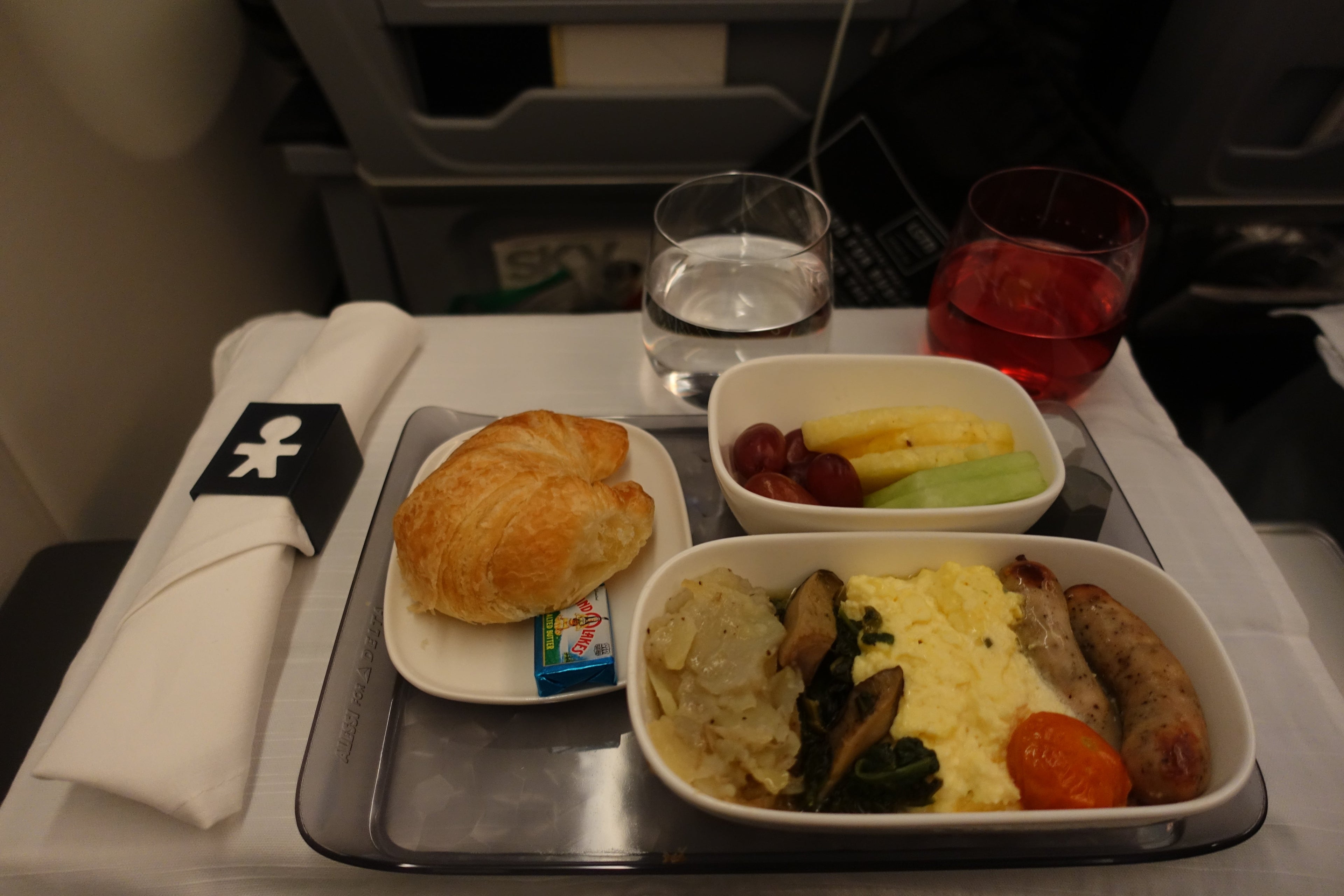 About 1.5 hours before landing, we were served a breakfast. There were two choices — scrambled eggs with chicken sausage and vegetables served with fruit and a croissant or Japanese-style yakisoba noodles with chicken. I chose the eggs, which were a bit dry, but the rest of the meal was tasty.