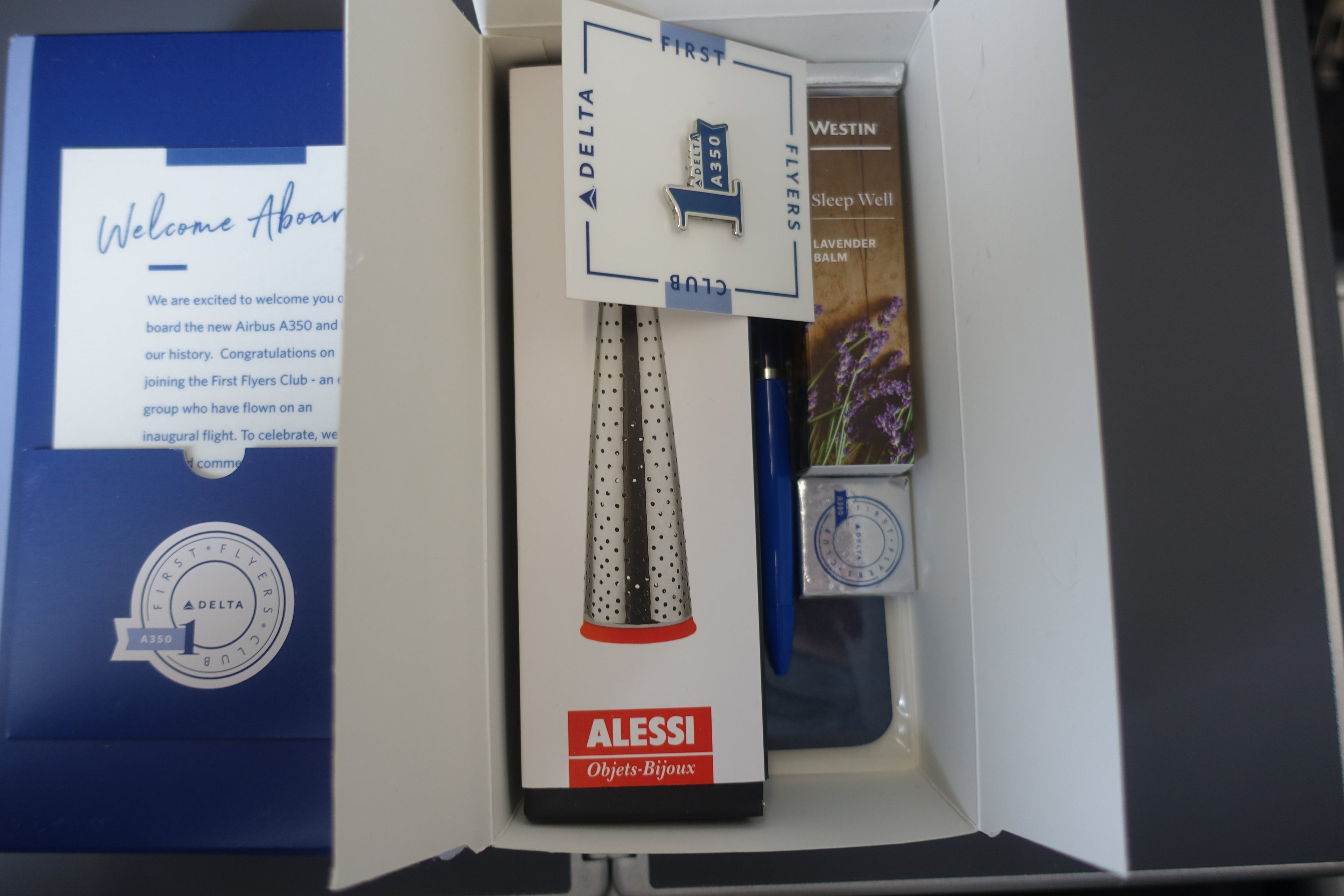 The gift box was likely only intended for the first A350 flight, and it contained several items including an Alessi tea infuser, some chocolates, Westin-branded "sleep balm," a commemorative pen, notebook, chocolates, and a neat pin to remember this history-making flight.