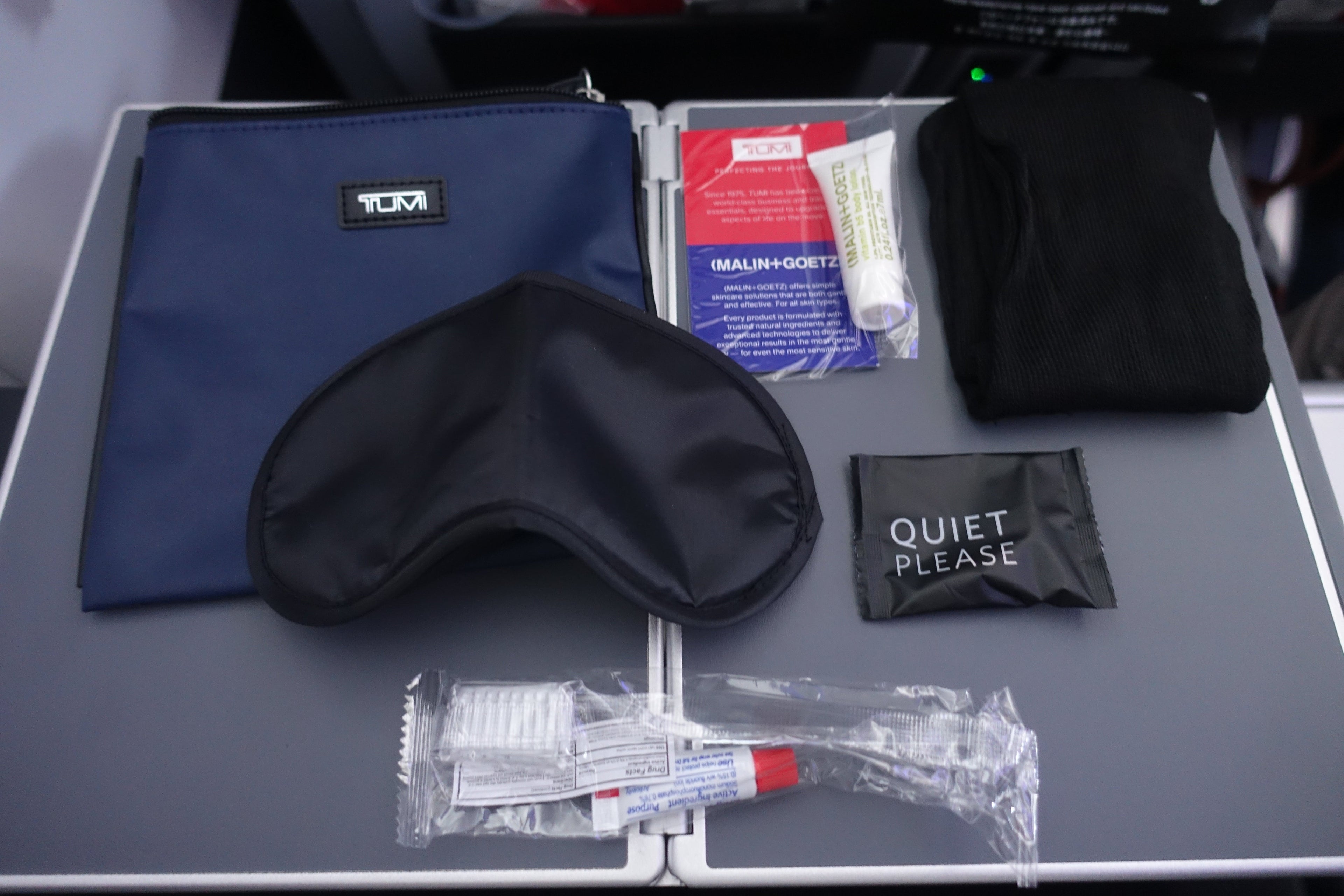 While it's definitely not the awesome-looking new amenity kits up in Delta One, the Tumi-branded kit in Premium Select is adequate. It contained socks, ear plugs, an eye mask, toothbrush and toothpaste and Malin+Goetz body lotion. I rarely use all the contents in an amenity kit, but I always and find a use for the cases they come in!