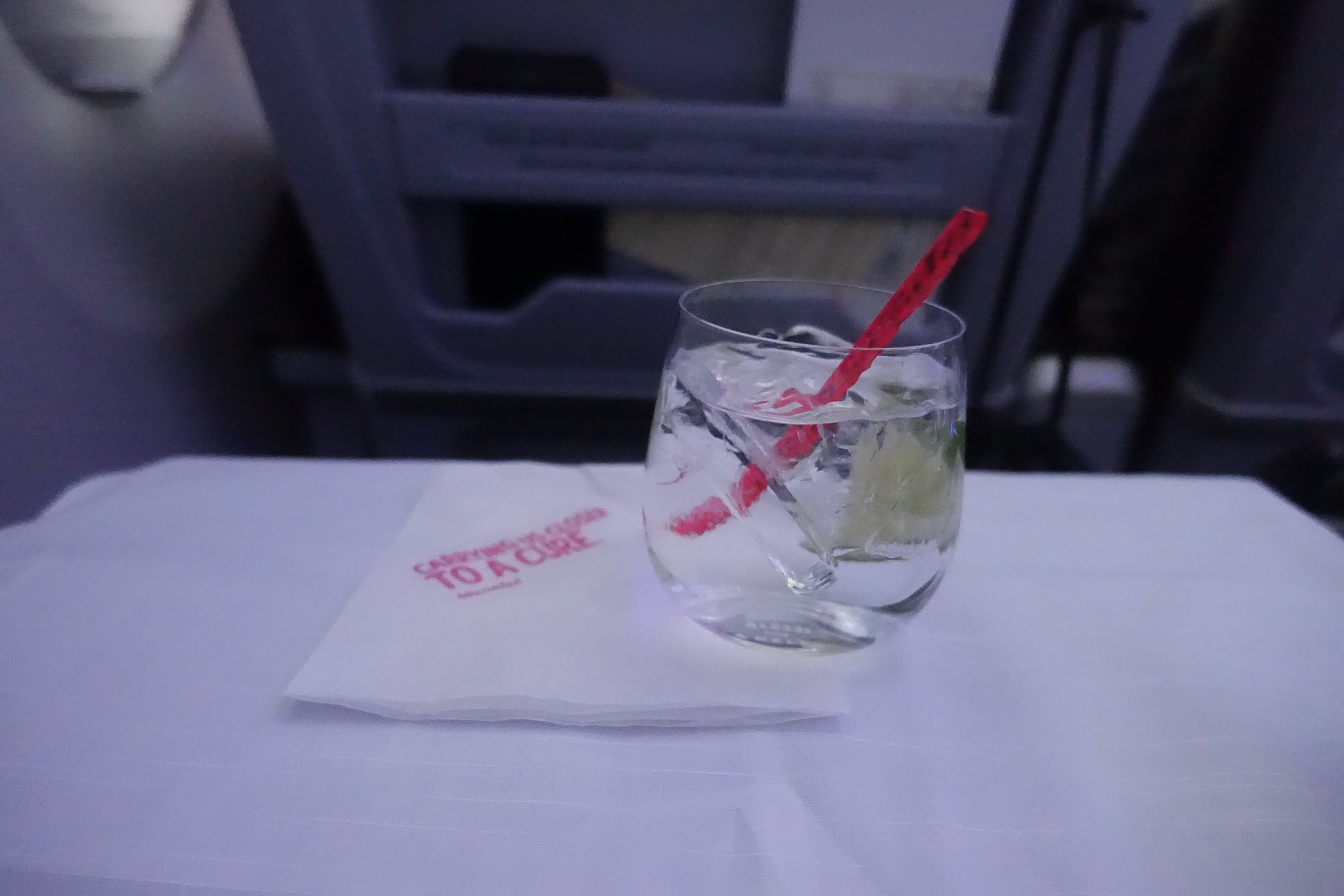 Shortly after takeoff, the flight attendants came through the cabin to distribute menus for Premium Select passengers as well as serve the first round of drinks. I chose a gin and tonic that was served in a proper glass, which helped differentiate the experience a bit from regular economy.
