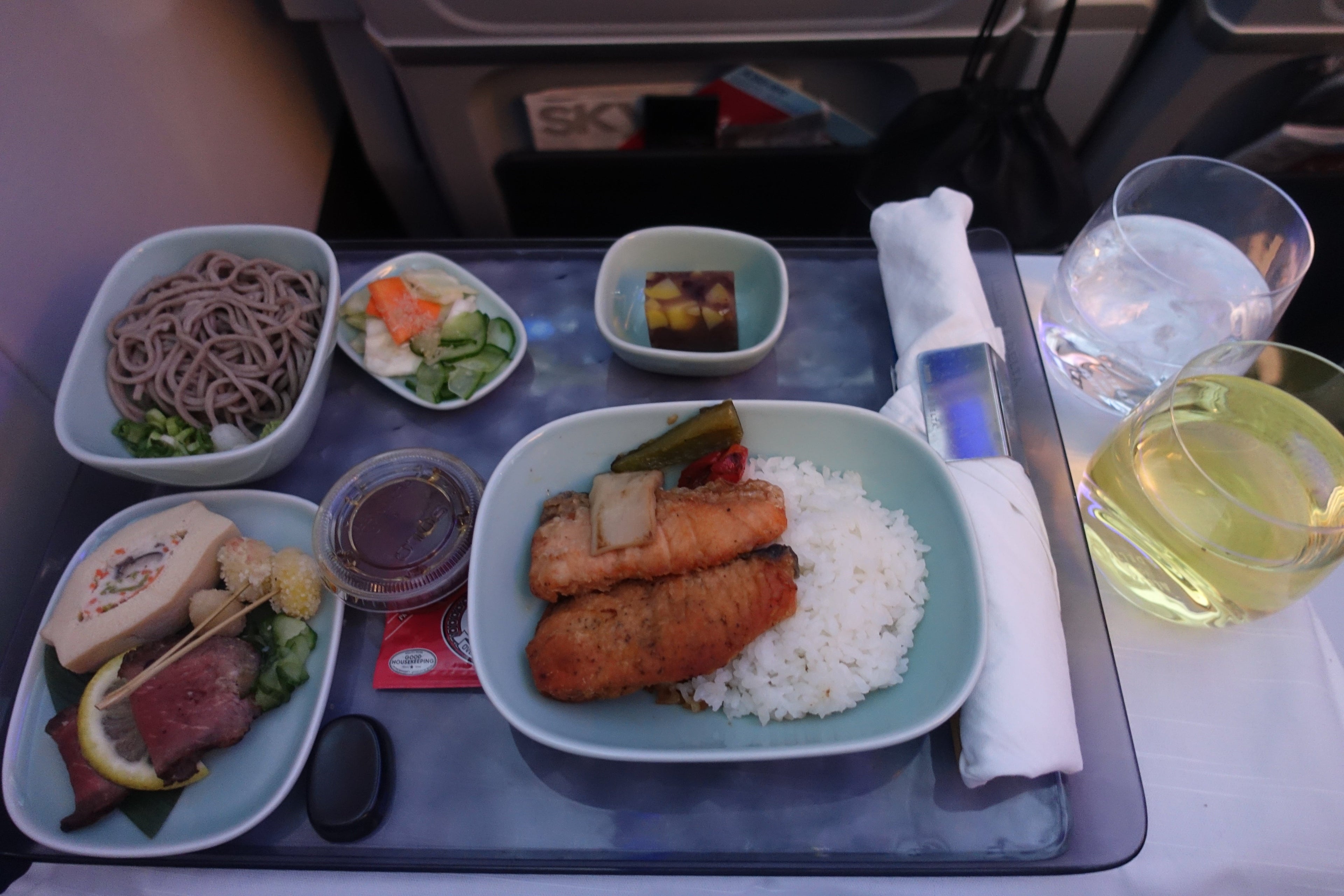 For my main course, I chose the Japanese entree, which consisted of salmon with rice in a sake sauce with steamed rice. In addition to the salmon, I had a beef appetizer as well as a bowl of soba noodles and vegetables. It was served all at once, which doesn't bother me in the slightest. I found the food to be very tasty, though I overheard flight attendants explaining to other passengers that they'd run out of the Western chicken dish, which seemed to be the most popular.