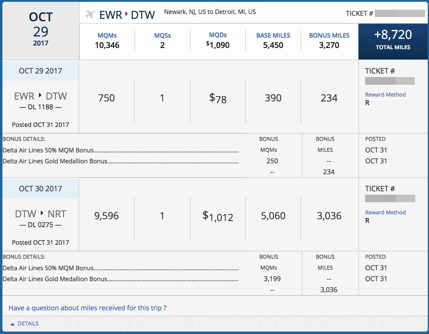 After my flight, I earned a total of 8,720 redeemable SkyMiles, 10,346 Medallion Qualifying Miles (MQMs) and $1,090 Medallion Qualifying Dollars (MQDs.) In fact, this flight put me over the threshold of MQMs required to reach Platinum status with Delta through January of 2019.