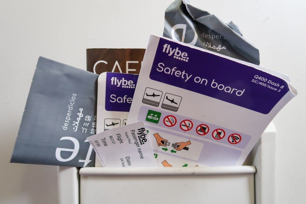While flailing my legs to demonstrate my rather unnecessary amount of legroom, I noticed quite a lot of stuff in the pouch in front. The usual stuff was there: inflight magazine, safety card and sick bag. But there was also unusual stuff there: a dirty napkin, a lounge voucher and the previous fella's boarding card right next to my right knee on the escape door. Don't get me wrong, that's not the end of the world, but someone obviously rushed cleaning the cabin, or it didn't even happen at all.