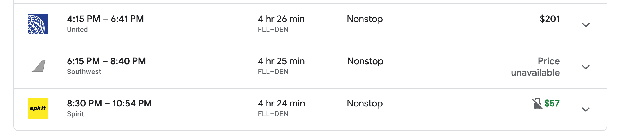 Take a look at this example of nonstop flights from FLL to Denver (DEN). The Southwest flight is pricing at $255 as of press time. Even if you purchase the Big Front Seat and a full-size carry-on bag, you'd be out $57 for the flight, $78 for the seat and $38 for the bag, totaling $173.