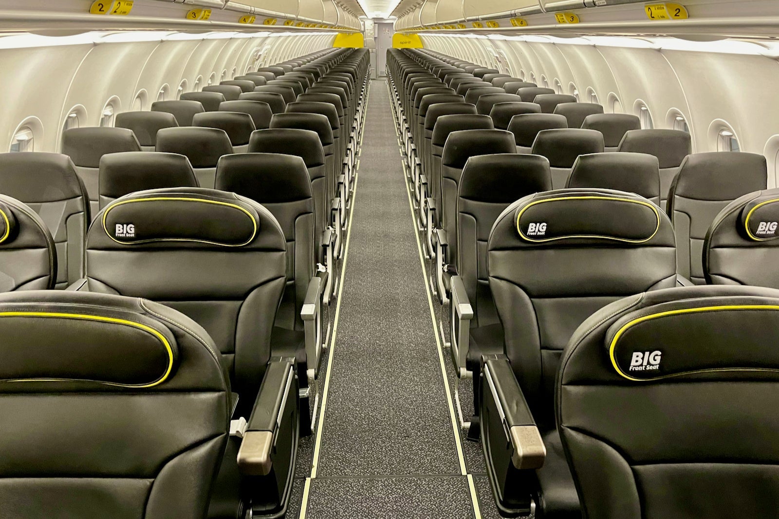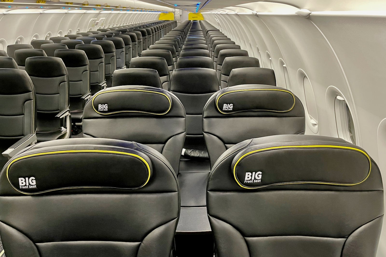 The first two or three rows of each jet feature Spirit's top offering, the Big Front Seat. With a 2-2 arrangement, 36 inches of pitch and 18.5 inches of width, this is essentially a domestic first-class seat — for the price of a coach ticket.