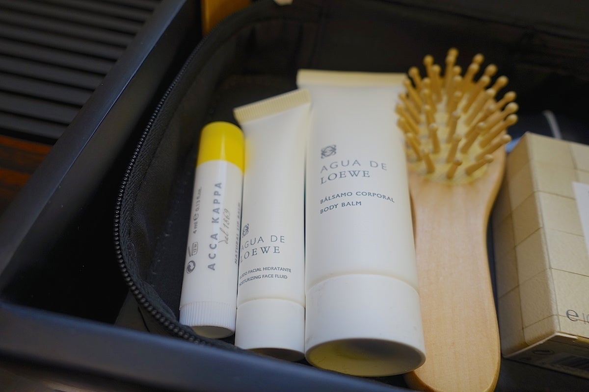 The amenity kit was already at the seat when I boarded and came beautifully presented in a black box that included Spanish Agua de Loewe face and body lotion, Acca Kappa lip balm, a wooden toothbrush and hairbrush, an eye mask and earplugs.