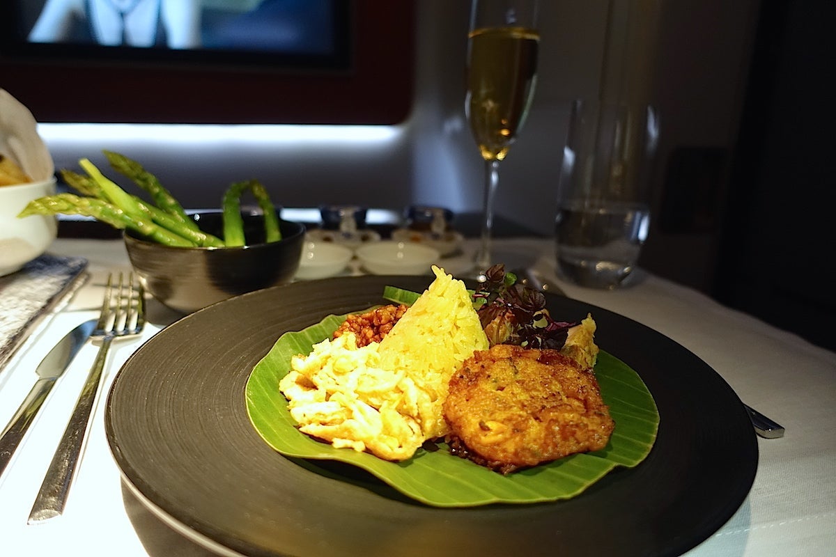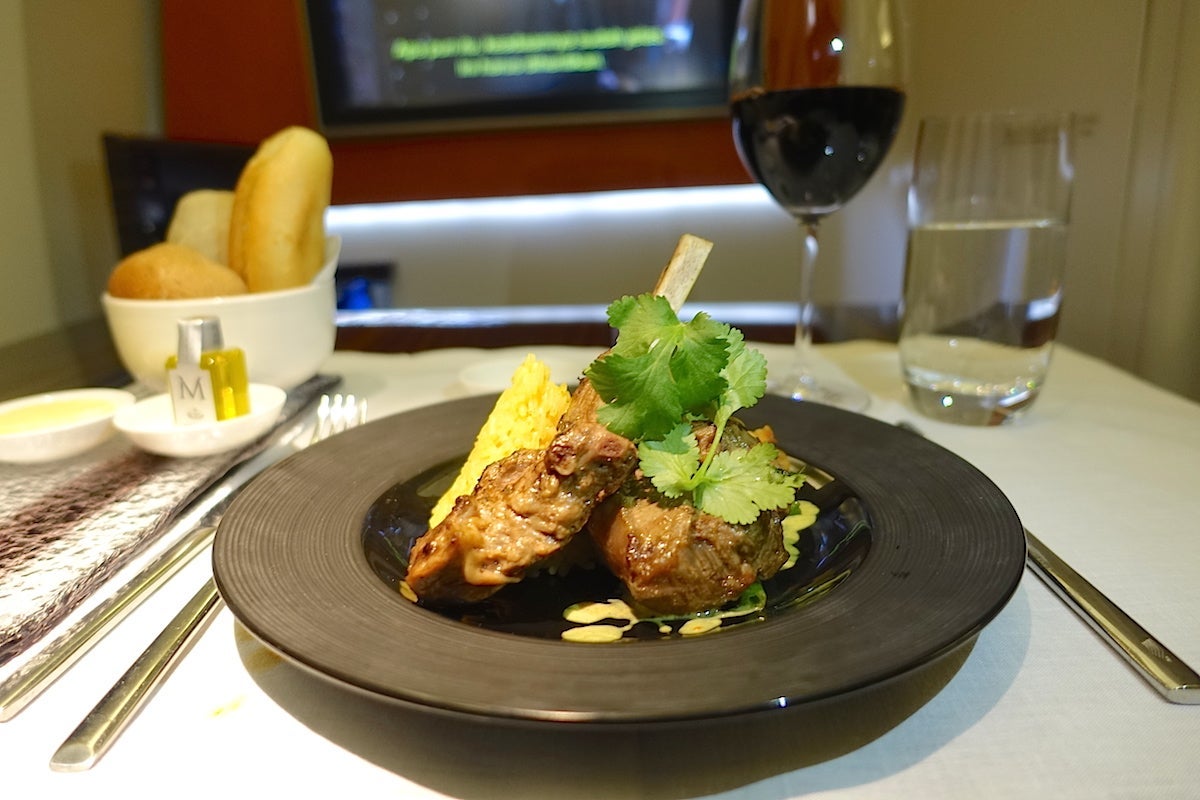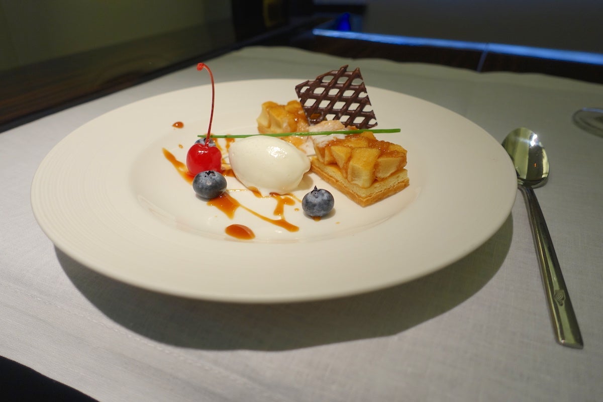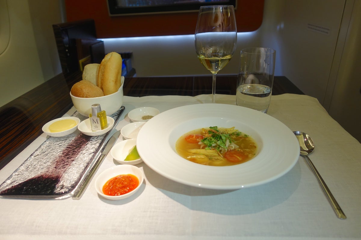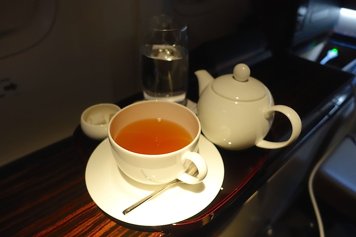 I think it's important to mention here just how delightful the crew were. There were four of them total who I interacted with in the cabin, including Rose, two other flight attendants and the onboard chef. All of them remained gracious and friendly throughout the flight, and always greeted me with a smile. My water glass never went empty and they brought me extra bottles before I went to bed for the middle portion of the flight. Whenever I finished a course, my dishes were cleared at once. As I mentioned, Rose hung my pajamas for me in the lavatory and then put my clothes into the seat closet for me — she also made sure to freshen up the lavatory before I went in there. It was like having my own private staff and they couldn't have been nicer. The service reminded me of a mix between the polish of the Singapore Airlines crews and the warmth of the crew members on Thai Airways. It was the perfect combination.