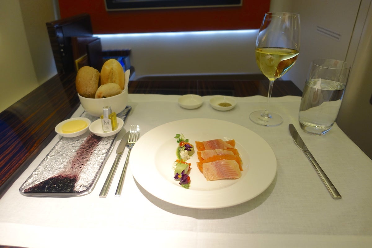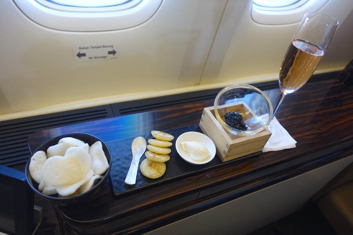 About 30 minutes into the flight, the attendants came by to serve the amuse-bouche, a signature caviar course including crème fraîche and blinis, and krupuk fish crackers as an alternative. I had mine with the rosé Champagne.