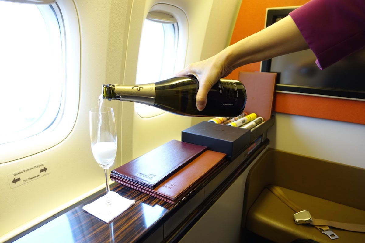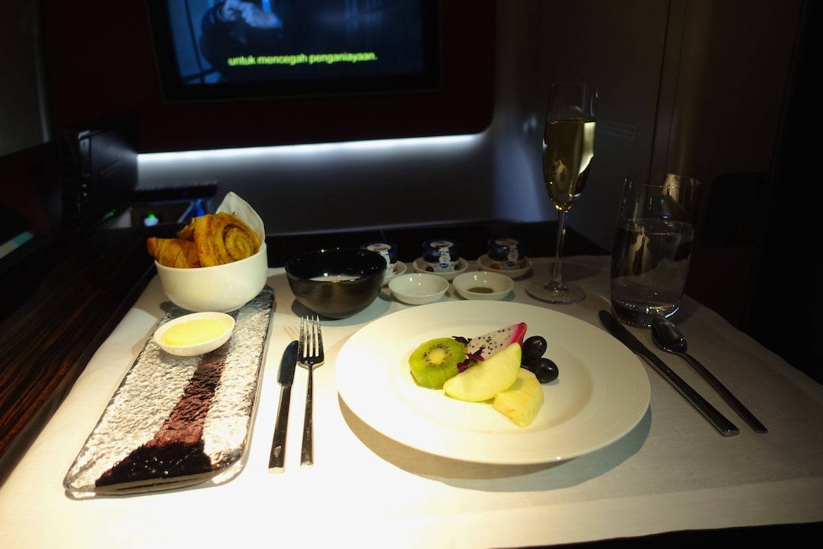 Though the cabin was much fuller this time — six out of eight seats were taken and the other two were filled in Singapore — we went through the same service routine, including pre-flight beverages, slipper service and amenity kits. I was disappointed to see that they planned to serve a light meal on the 90-minute flight to Singapore and then just offer snacks and a single full meal service in the morning before we landed. I wanted to hold off on eating until the second flight in order to try to acclimate to the time in Europe as soon as possible, and once I explained that to the crew, they knew exactly what I wanted and just came by to make sure my water and Champagne were full.