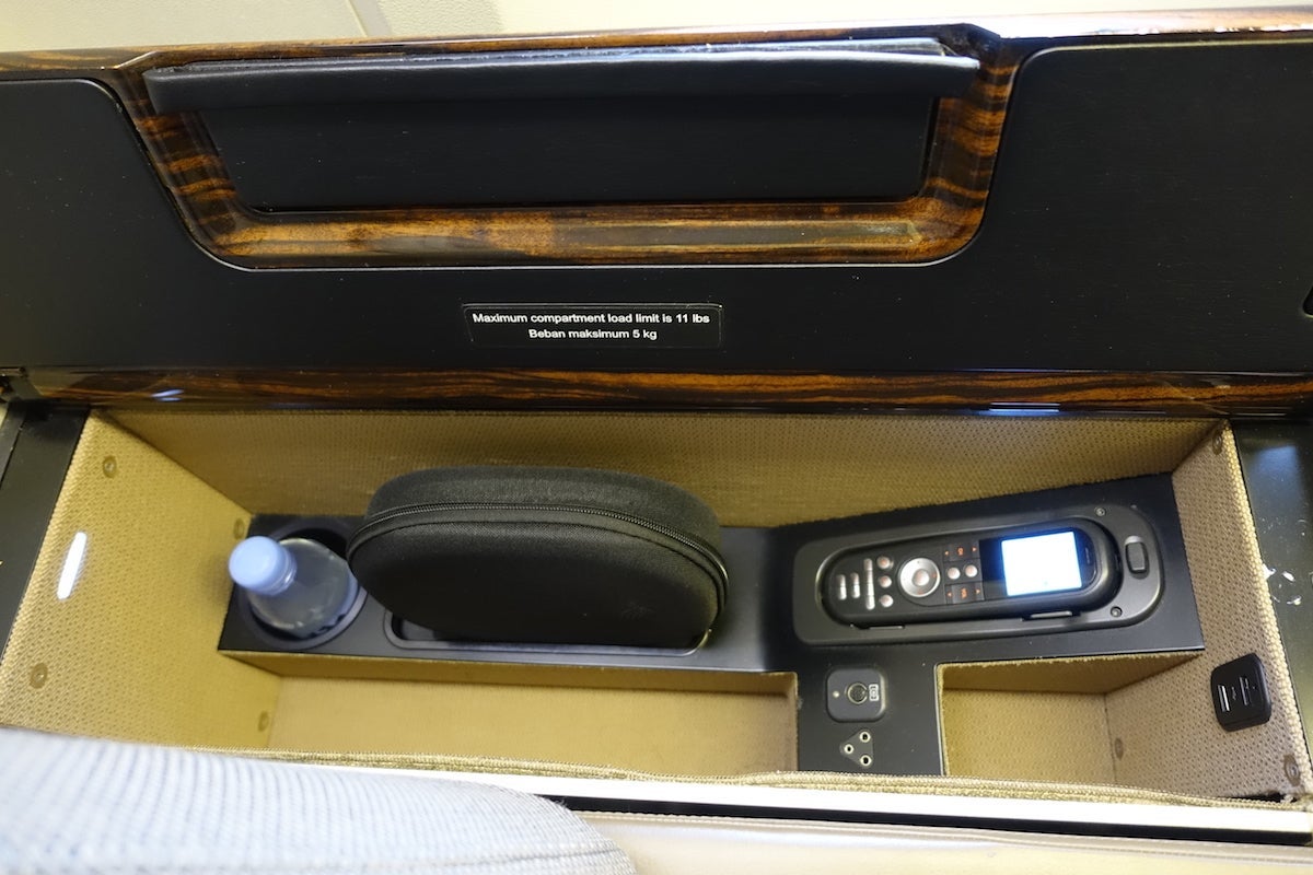 Along the wall were a few different storage compartments. The one closest to the seat itself held a small bottle of Evian, noise-cancelling headphones and a sort of cubby where I could stick my laptop. It also held the remote for the in-flight entertainment system and had a USB port, where I plugged in my phone.