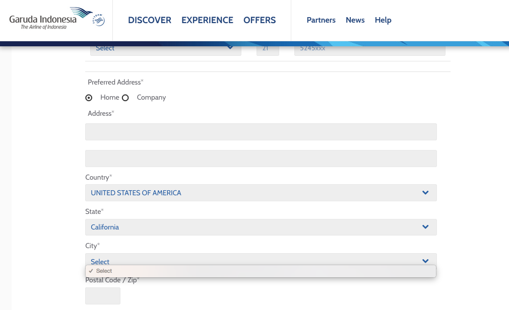 2. Account registration woes. Next, you had to be able to register for a Garuda Miles account. But the carrier's sign-up page didn't seem to be letting people from the US do this because you couldn't select a city for your address and thus couldn't complete the registration process.