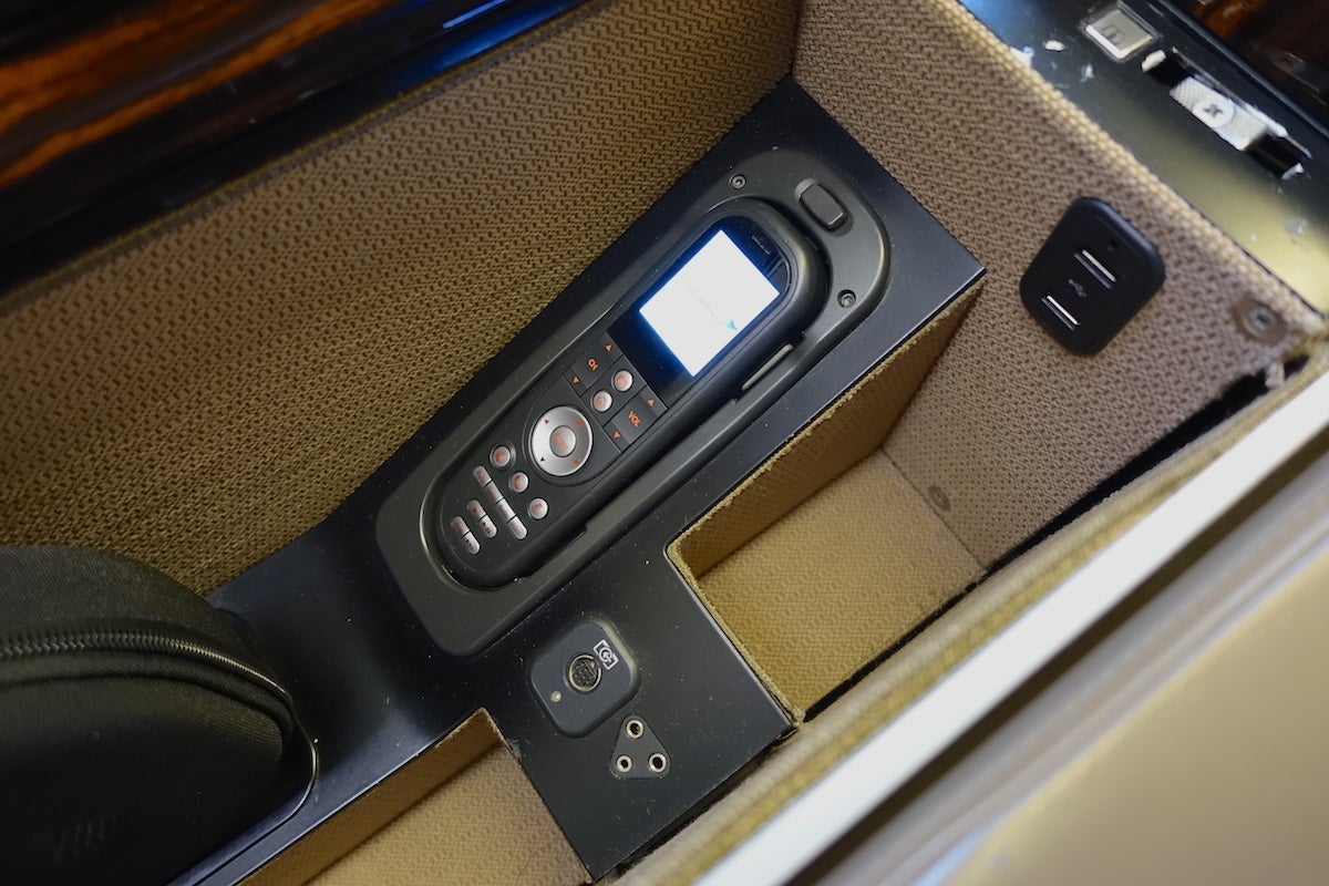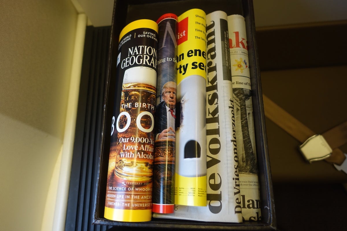 The end of the seat-side storage is another small cubby where there's a universal power port. On top of that, I found a selection of newspapers and magazines as well as an amenity kit waiting for me.