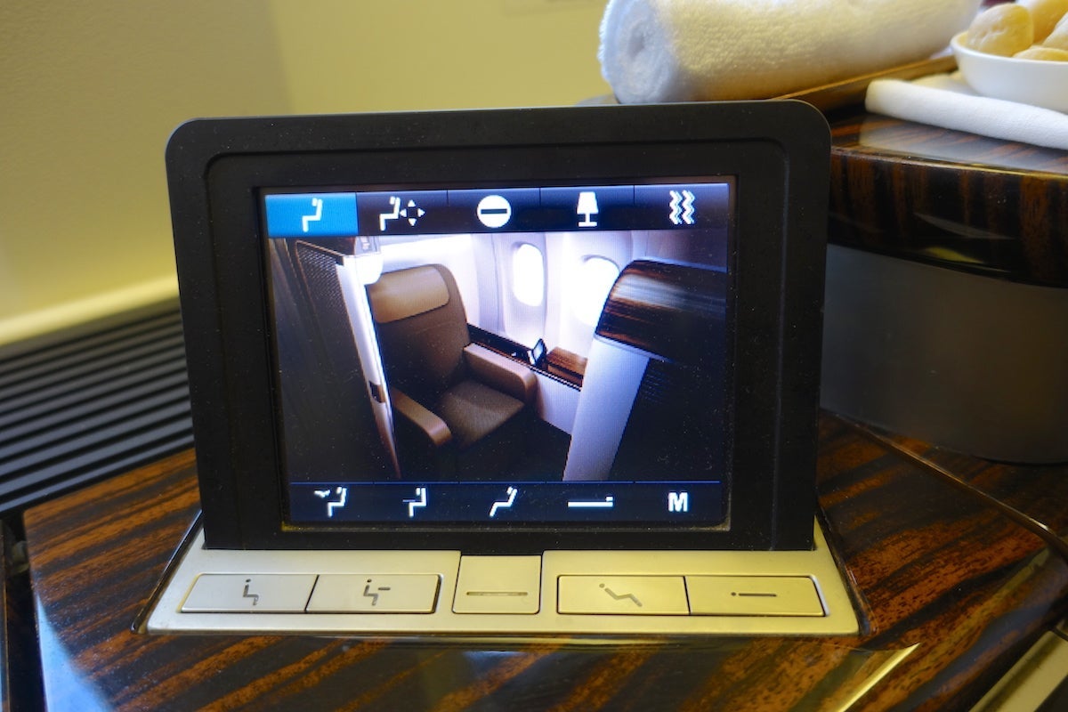 Next to that was a touchscreen with the seat controls. There were four pre-set positions, including one for takeoff and landing, one for dining, one for relaxing and one for the lie-flat mode for sleeping. There was also a mode where you could adjust the individual seat components like the seat-back, the bottom cushion and the leg rest to your desired configuration. The touchscreen also controlled the reading light next to the head of the seat — not the overhead light — and had a button for the seat's massage function.