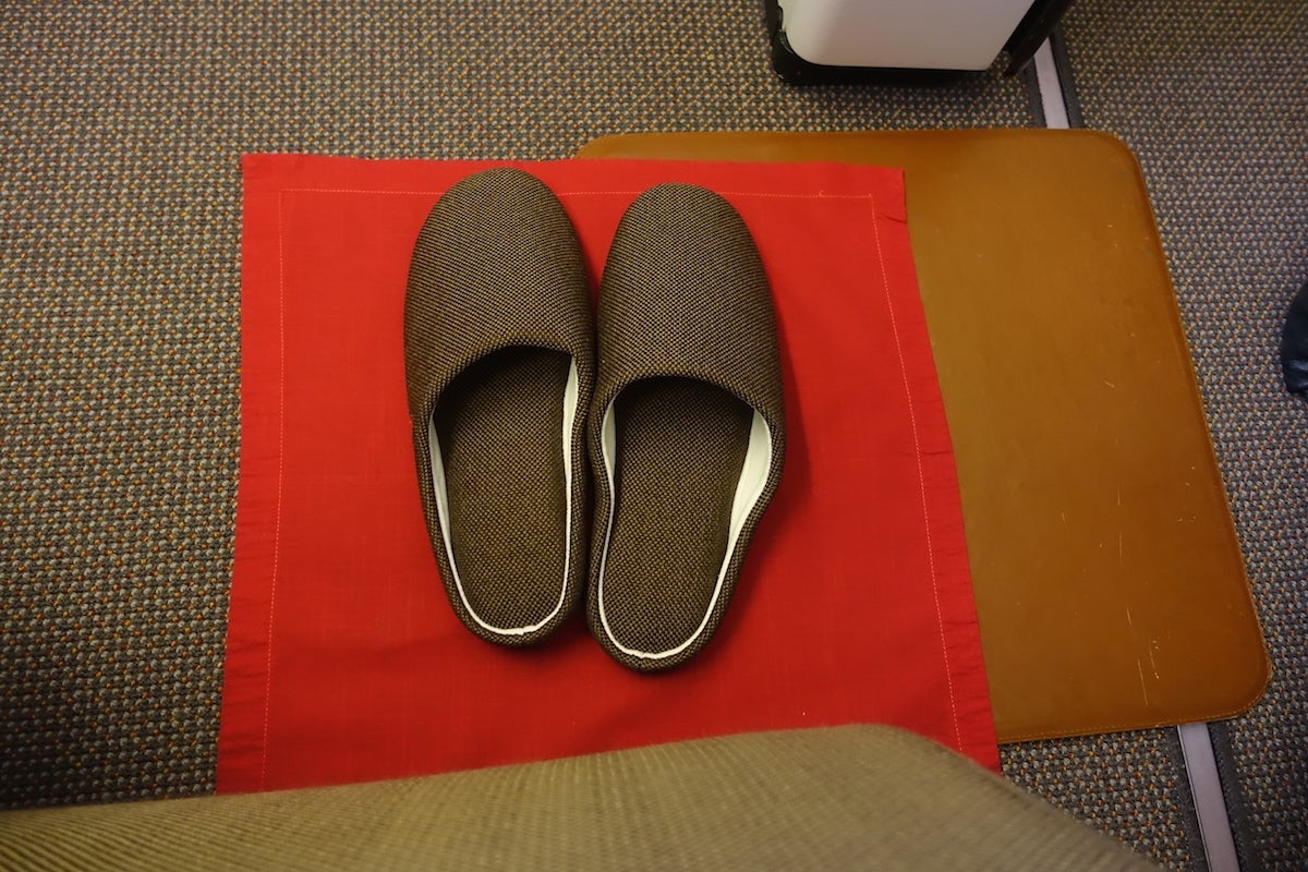 She came back a moment later with a pair of slippers in hand and asked if I'd like to give her my shoes and change into them. I said yes and took off my sneakers, which she placed in individual shoe covers and into the seat placard where the hanger was.