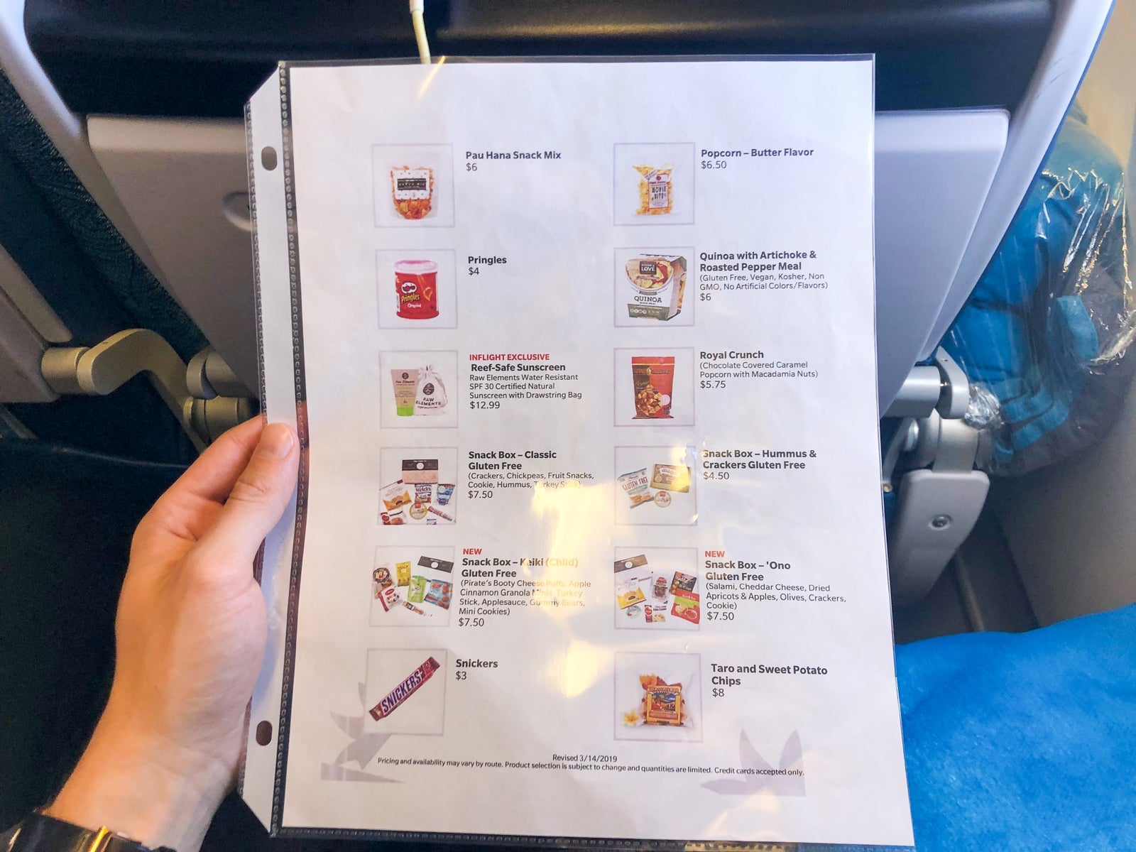 We took off right on time, and about 15 minutes later, the cabin crew announced there'd be a light snack followed by drink service. But before any free service, they came through with a menu of snacks available for purchase. The free meal was coming out in about a half hour, so I passed.