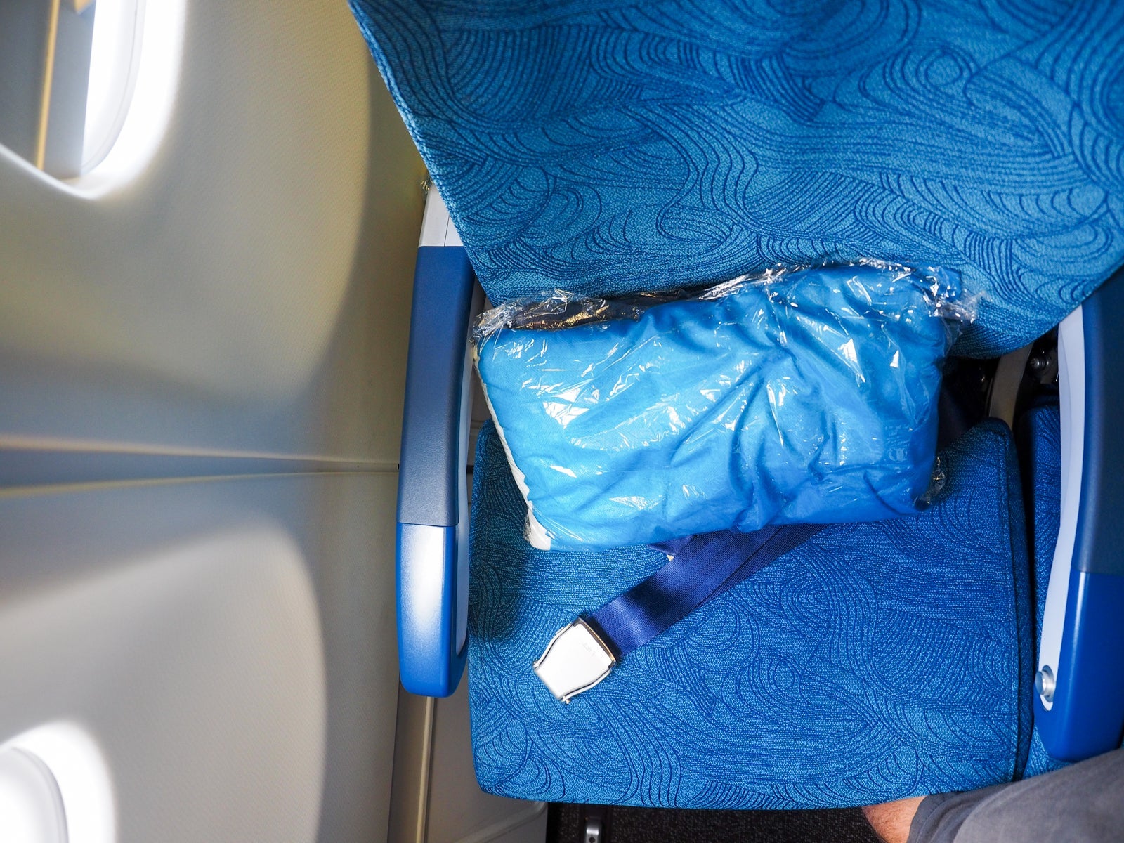 Upon arriving at Seat 37J, I noticed the standard collection of items at the seat: a small pillow and lightweight blanket, each wrapped in plastic.