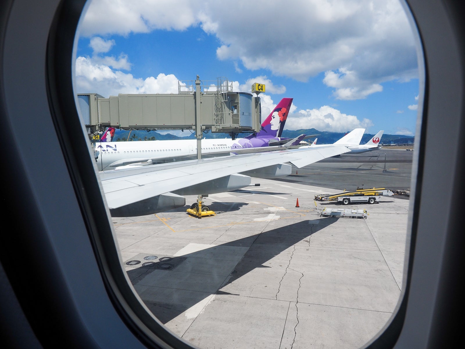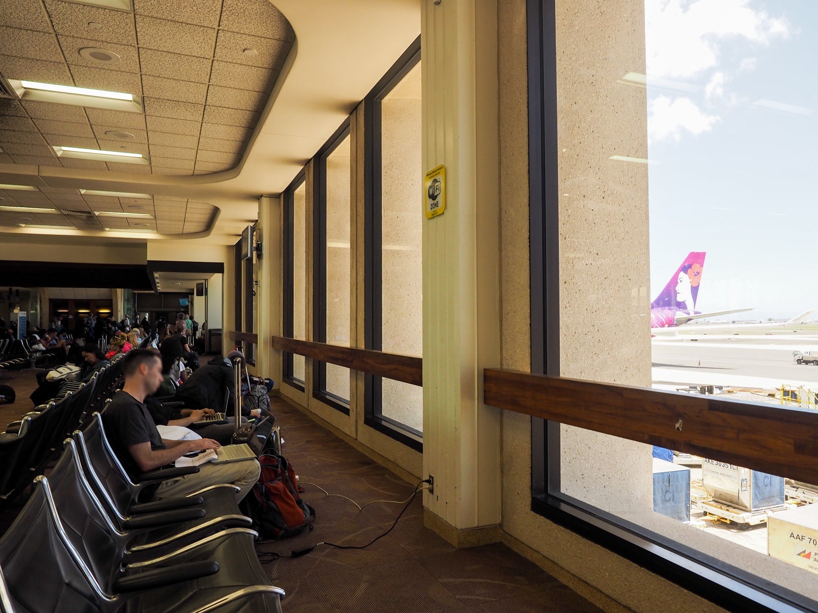 Lack of eating options aside, the gate area was pleasant. While a few gates were packed, the Boston-bound gate was relatively spacious. I even found a seat — although struggled to find an available outlet. I knew I'd have one on the flight, however. And there I sat, watching planes land on one of HNL's runways.