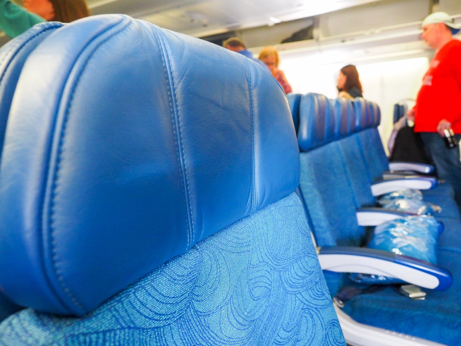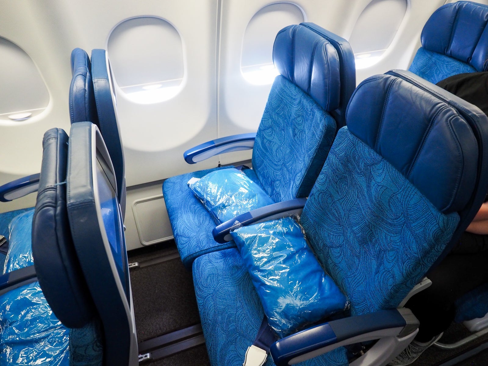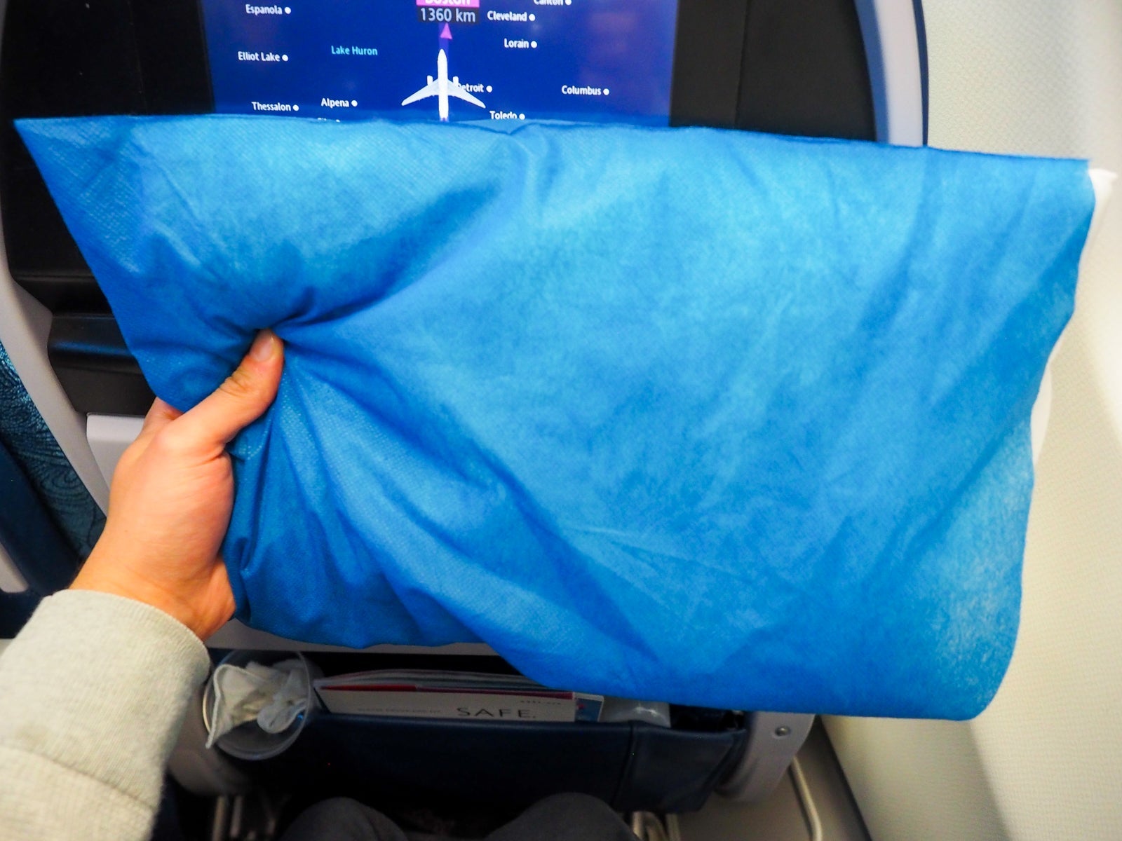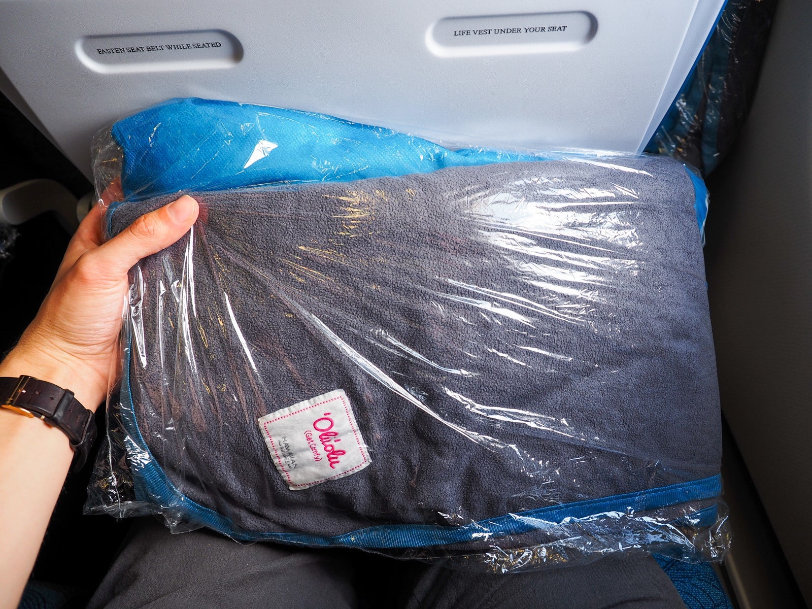 Upon boarding, I found a blue pillow and a blanket at every seat. At first, the pillow seemed a regular economy pillow, but later in the flight it seemed worse than that. The blanket was as thin as you'd expect it to be, but it had a fun blue edging that set it apart from the typical thin, scratchy blankets you get on other carriers.
