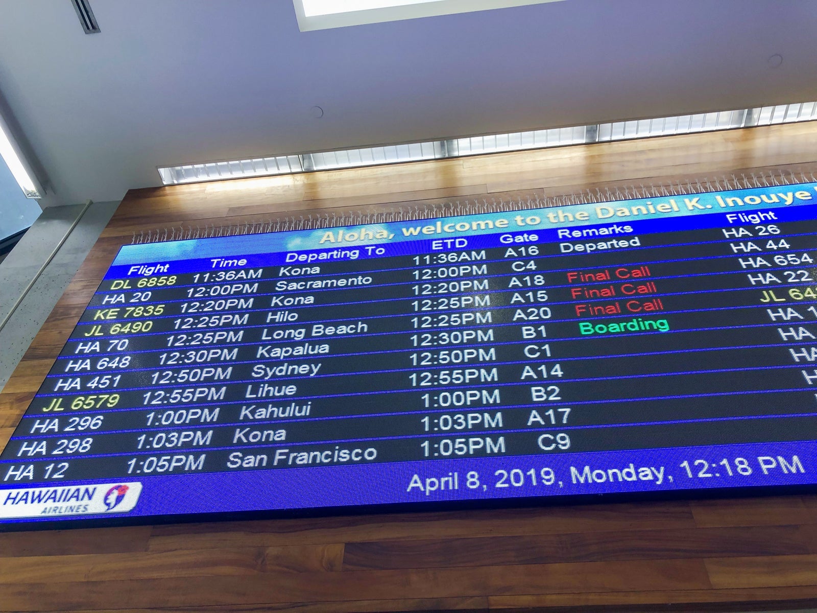 It was a typical sunny day in Honolulu, and Hawaiian 90 was scheduled to depart on time when I left for the airport. I arrived at HNL's Terminal 1 at 12:15 pm for a 1:55pm flight with boarding scheduled for 1:10pm. I arrived especially early because the HNL security scene is notoriously busy. Even with TSA PreCheck, I anticipated a security wait of at least 20 minutes.