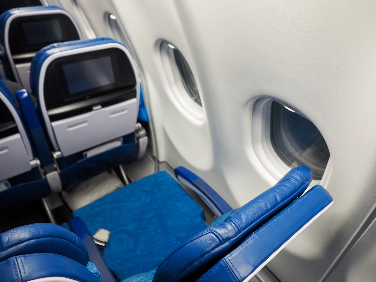 The cabin on my flight was clean. I had 37J, a window seat in the aft cabin. Weirdly, it seemed that the bottom cushion was just slightly forward of the others. It was stocked with a small pillow and light blanket. All seats in economy had a high-definition seatback screen (which wasn't available to use until after takeoff), and a USB charging port.