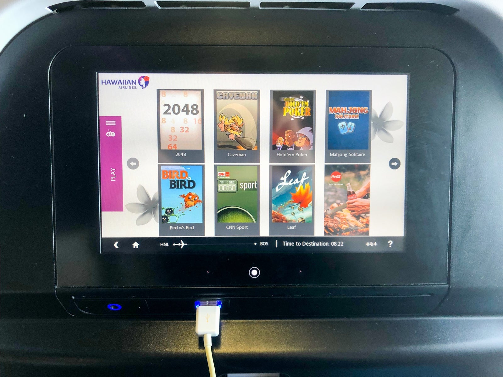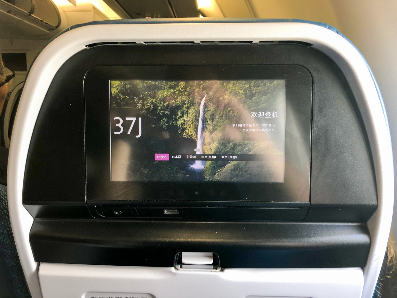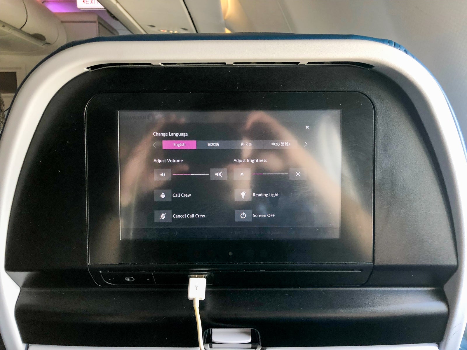 Every seat was stocked with a personal HD IFE screen with complimentary content (compare that to most of Hawaiian's domestic flights, where you have to pay for entertainment), USB charging port and audio headphone jack. Until the entertainment system was activated and fully functional a minute or two after takeoff, the screens displayed a welcome image with a language selector.