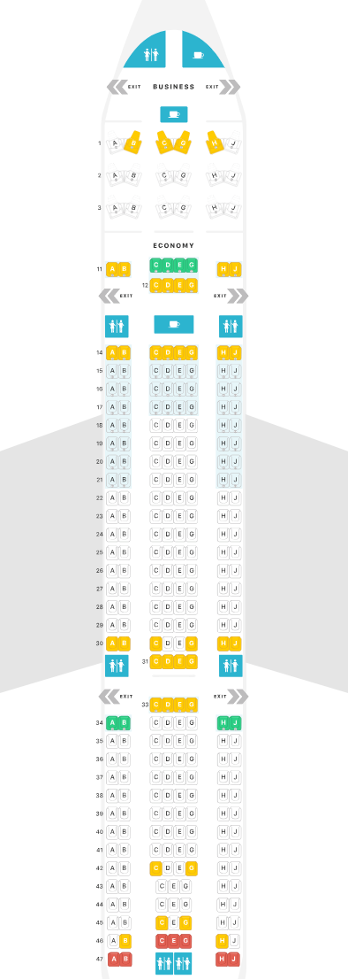 Compared to other long-haul airplanes like the Boeing 777, 787 or Airbus A380, the 2-4-2 seating arrangement means that, if you're a window flyer like me, you'll only have to climb over one person on the way to the bathroom instead of two. And if you're really lucky, you won't have a seatmate at all.