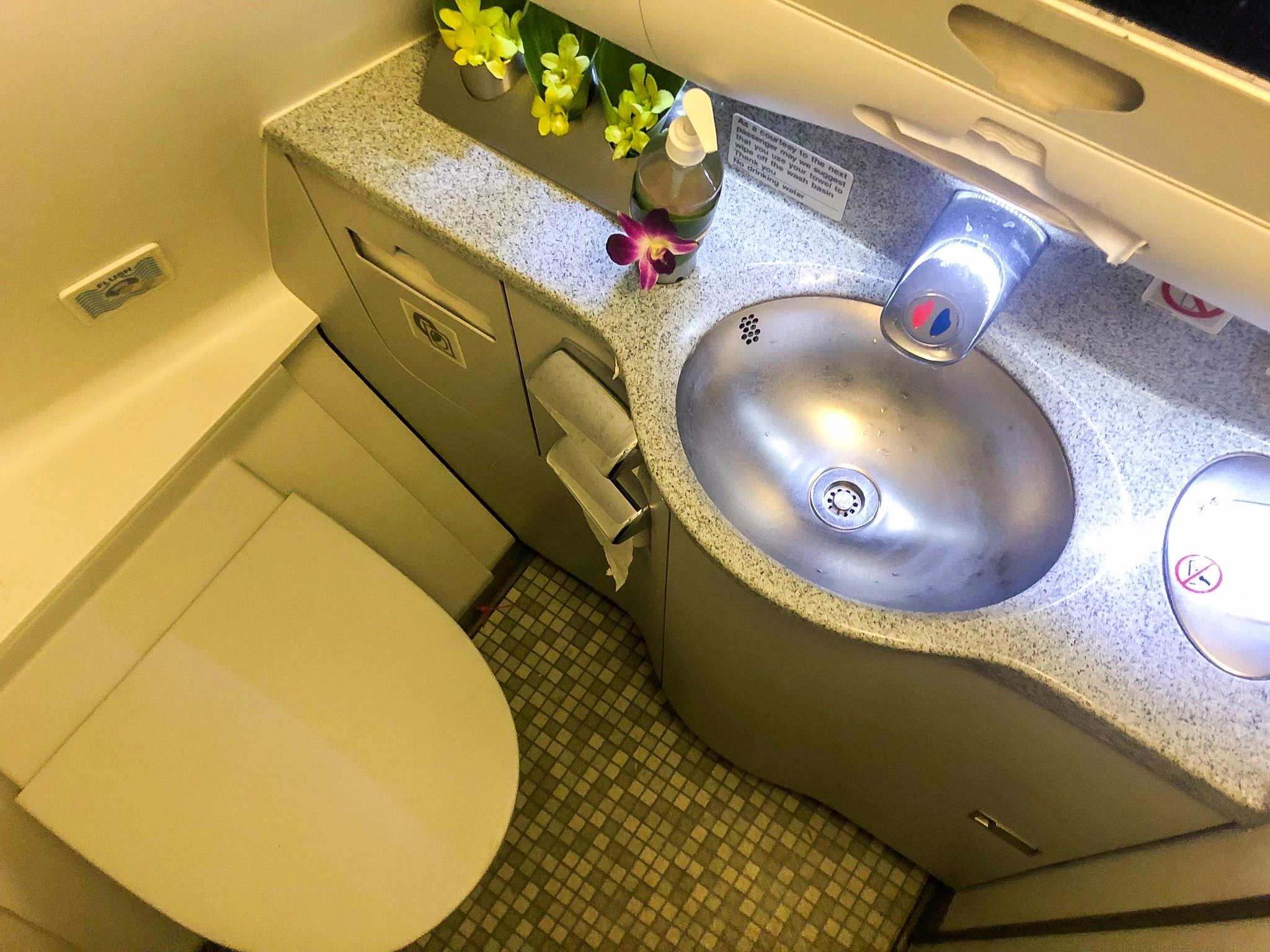 Lastly, the first-class bathroom was neat, with Hawaiian soaps and a linoleum floor with a tile pattern, plus a few flowers.