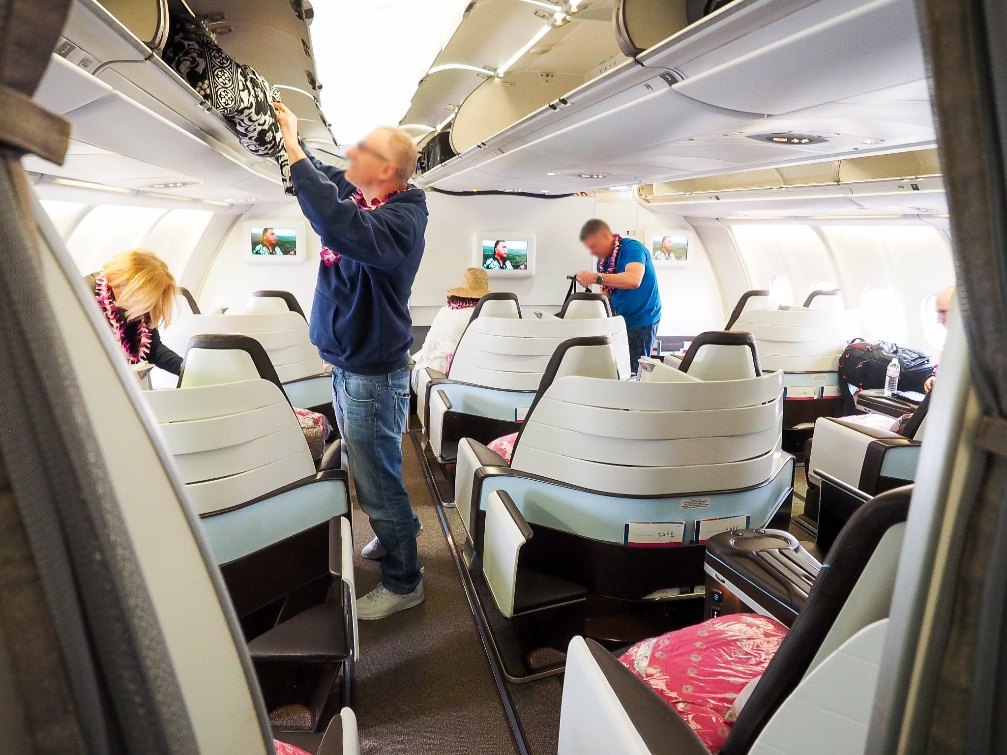 By the time I got to my seat, the first-class cabin was already filling up. Right away, it was clear that Hawaiian aims to bring its aloha spirit inside the cabin — the color scheme and the airiness of the seats got me in the mood for an island adventure.