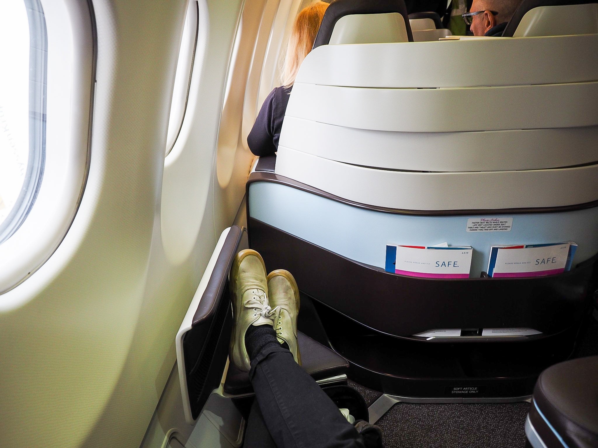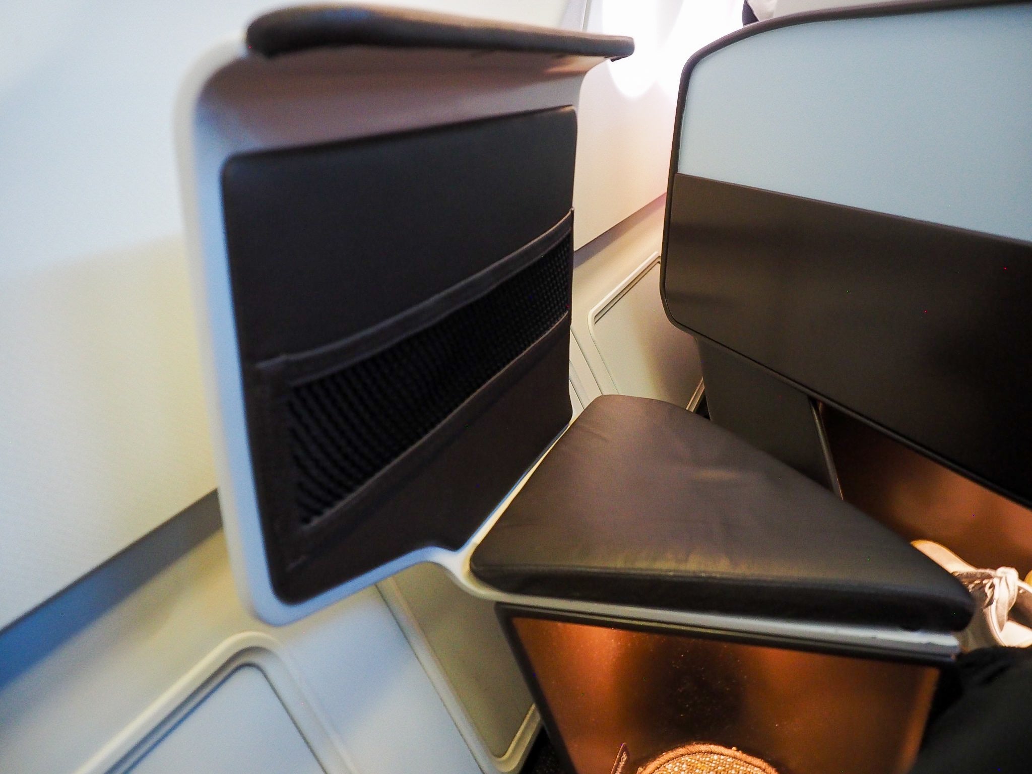 Besides the IFE setup, the only major qualm I had with the seat was the lack of storage space. With just a small area on either side of the seat, a place for shoes and two other small mesh pockets (one right beside you and one by your feet), I didn't really have much room to put anything other than my phone, some small flexible materials, the amenity kit and the small water bottle that was waiting for me at my seat. On the plus side, the footrest design meant trips to the overhead bin didn't disturb my seatmate, even in bed mode.