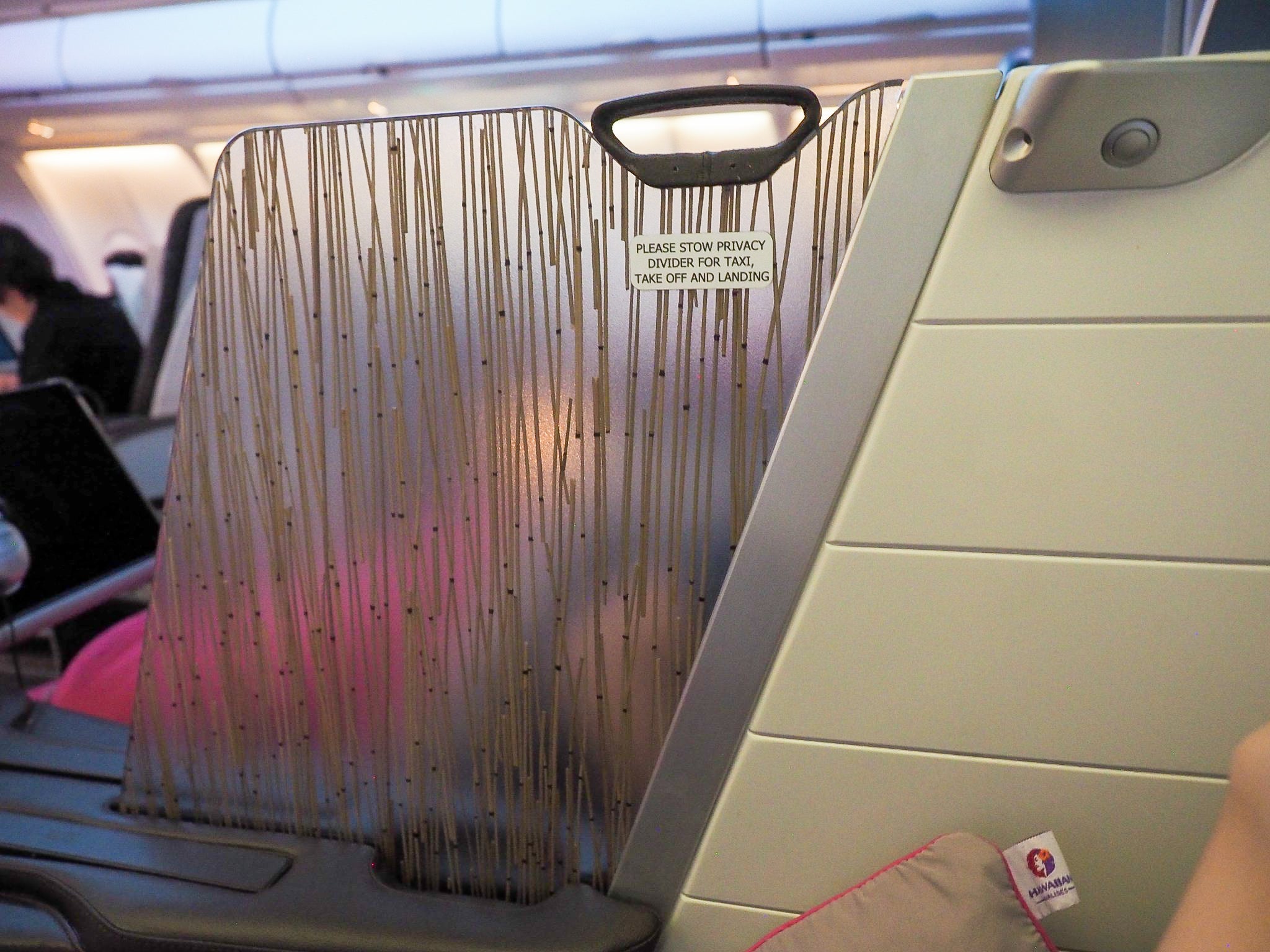 Since not everyone flies with a companion, Hawaiian installed privacy dividers that could be raised and lowered. I tried it out when I wanted to get some rest. It was quite effective and added to the overall aesthetic of the cabin, in my opinion.