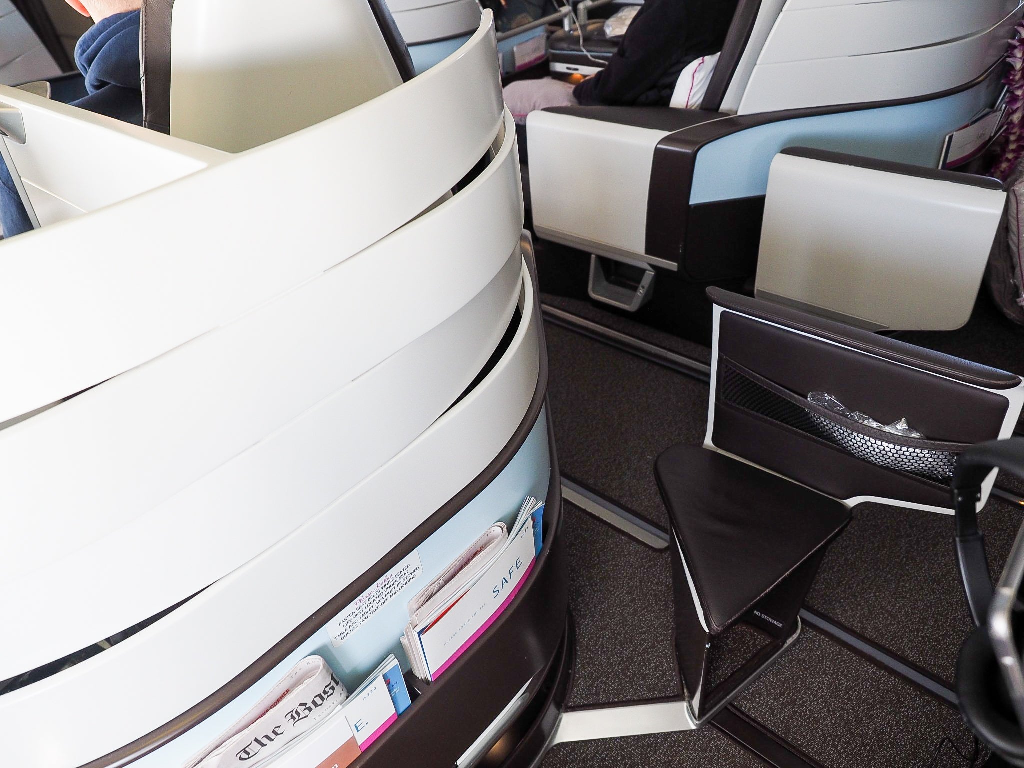 There was a small, leather ottoman that became a part of the bed when it lay flat. The footrest had a half wall that didn't really serve a purpose on window seats but helped with keeping your feet from falling into the aisle if you were seated in an aisle seat. This half wall had another mesh pocket, but it was too small to hold much. If anything, I'd recommend keeping your phone or computer charger here.