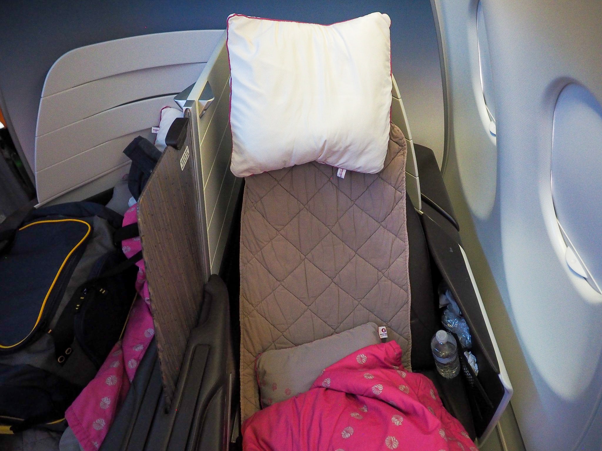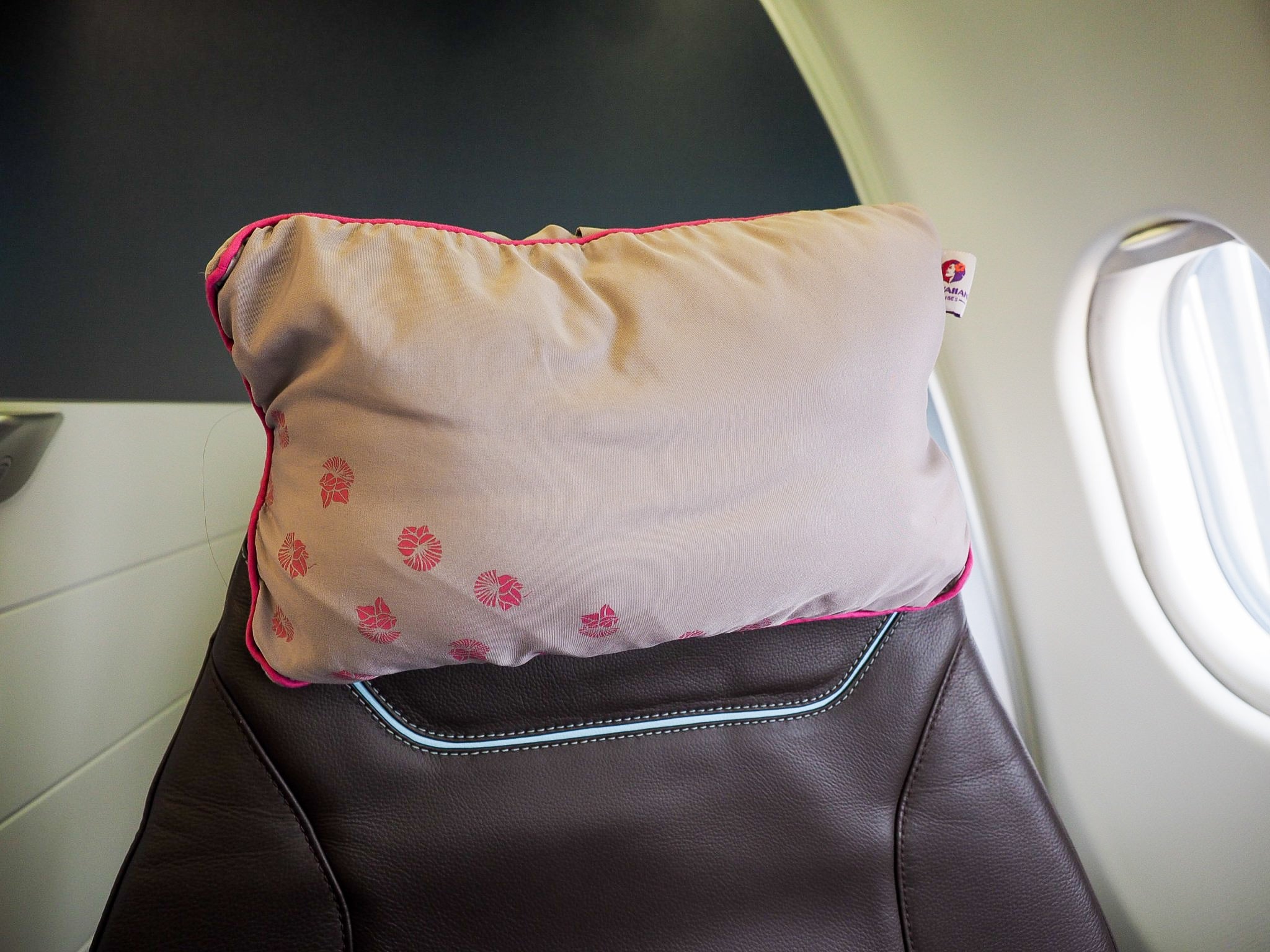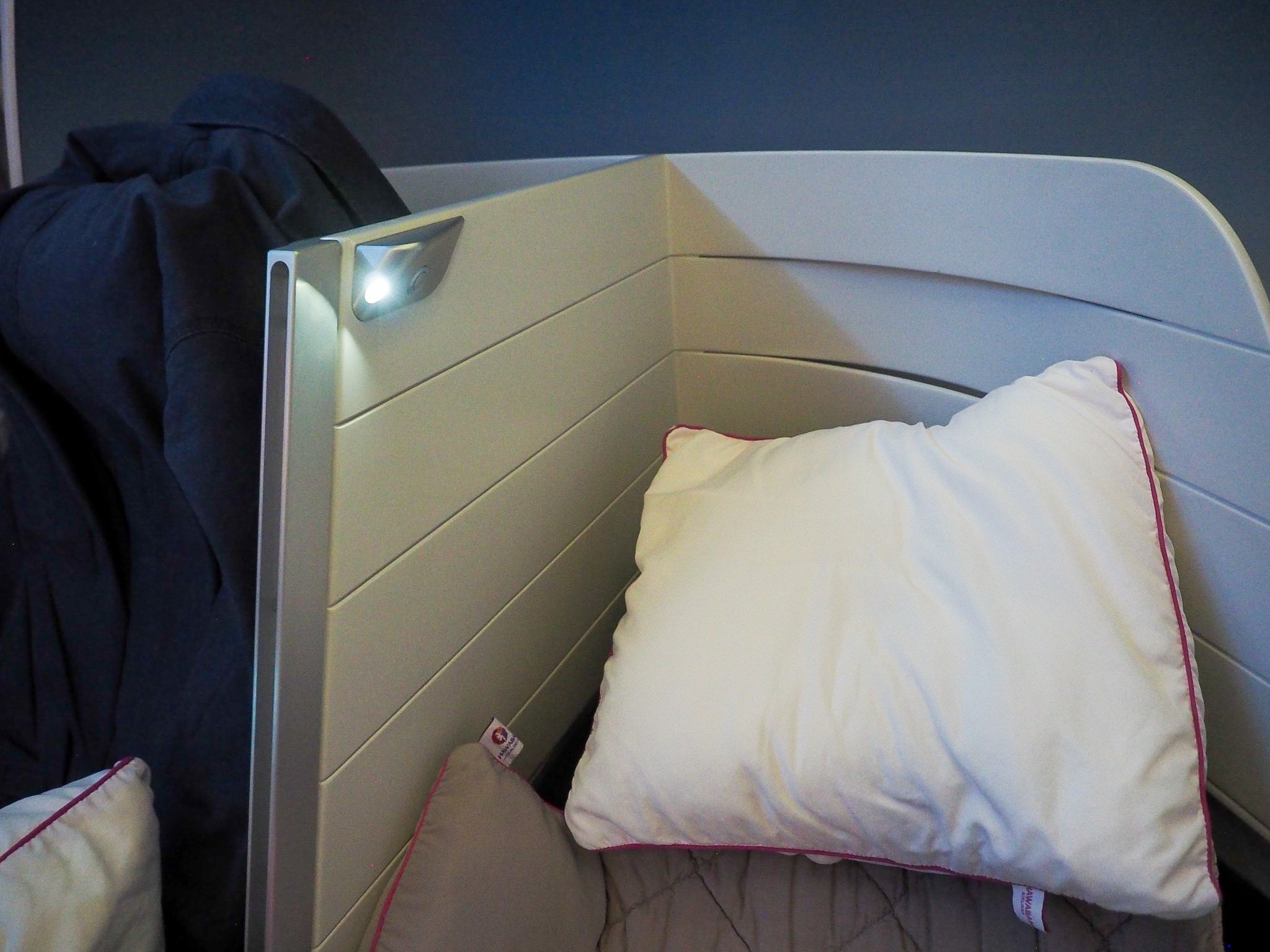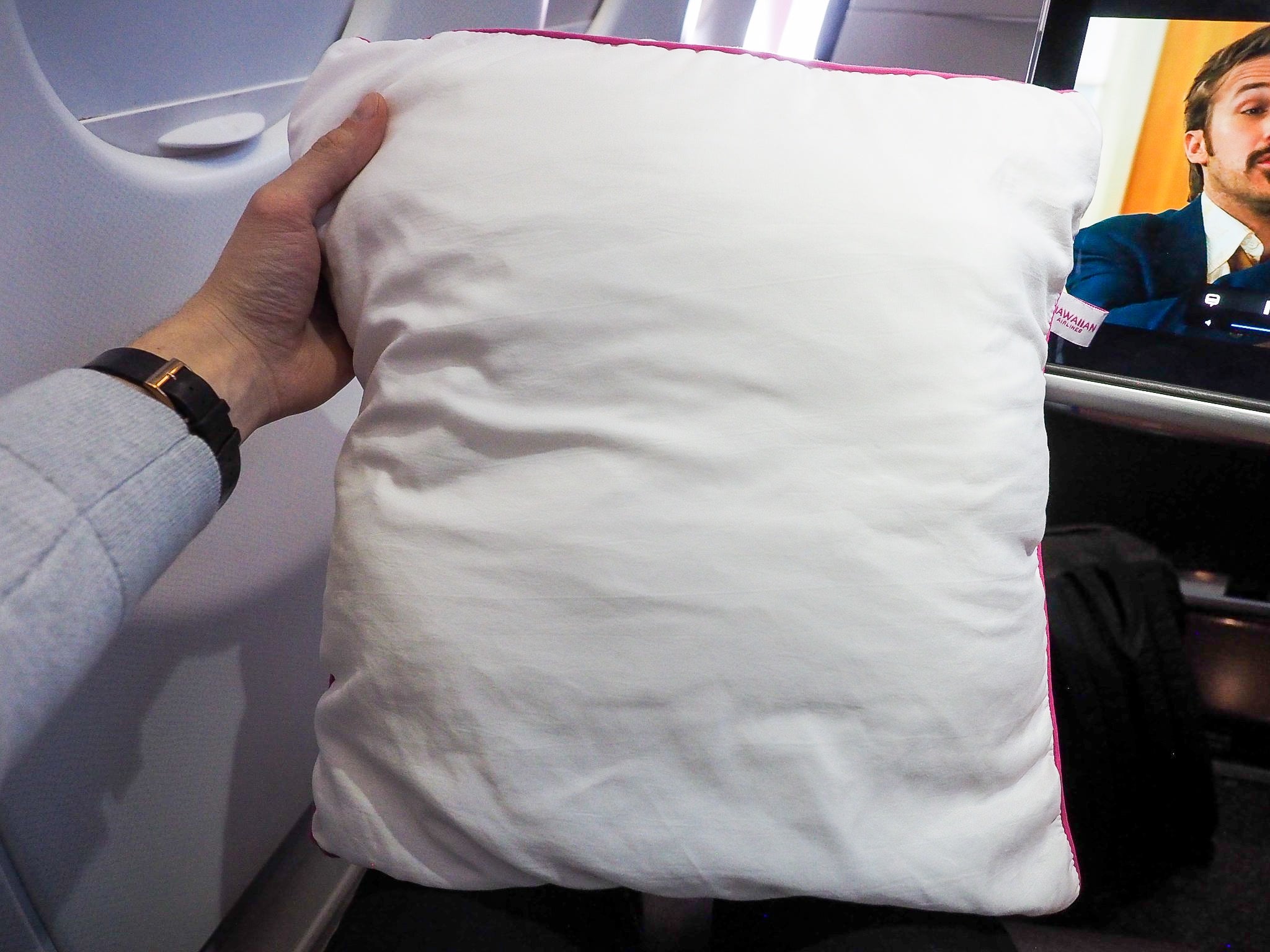 The larger pillow, bigger than the ones you get in economy but smaller than some of your typical international business-class pillows, was fine but nothing outstanding.