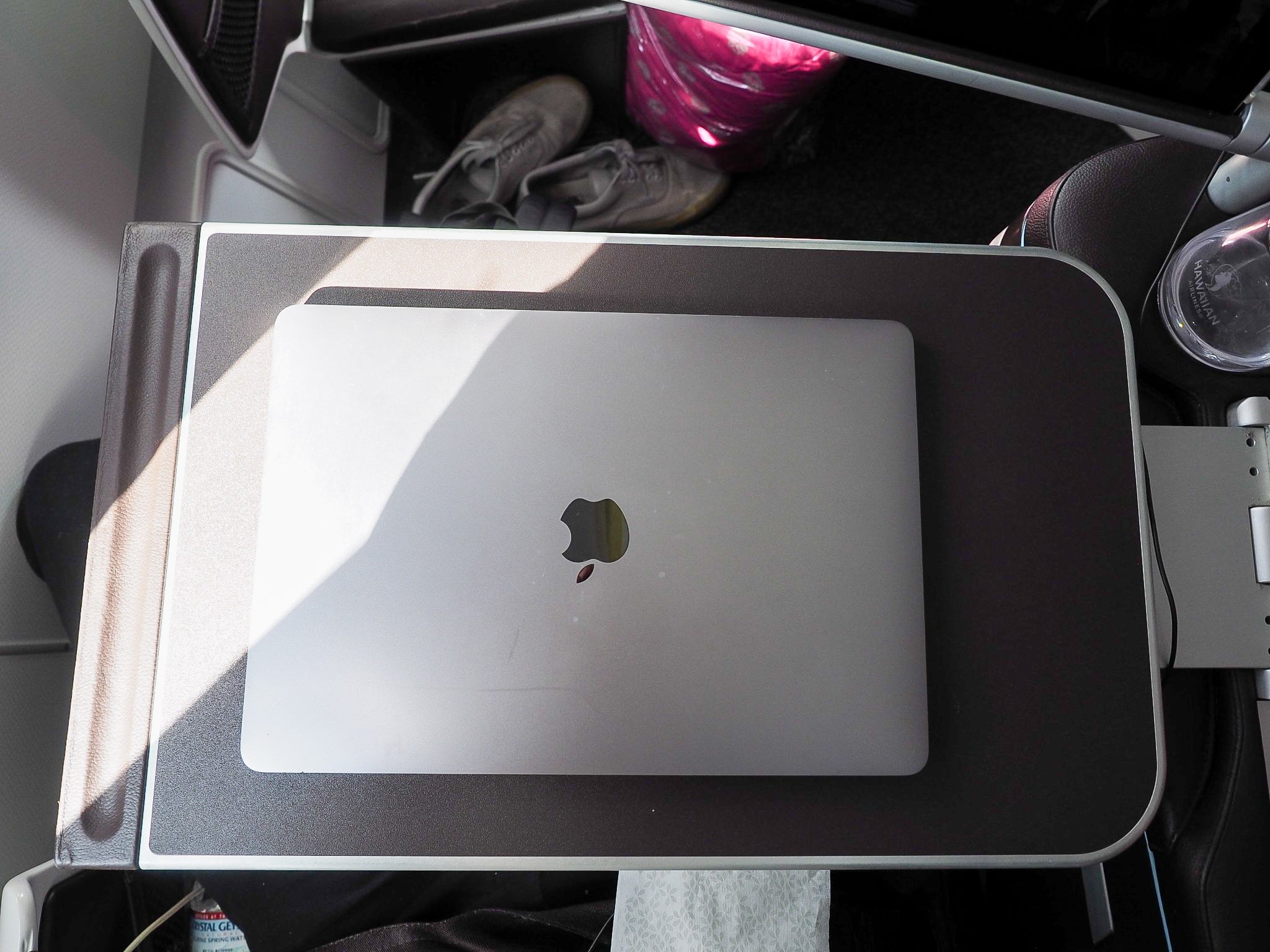 The tray table is quite large and could be accessed with a firm press of the leather panel between the seats. I easily fit my 13-inch MacBook Pro next to a glass of water.