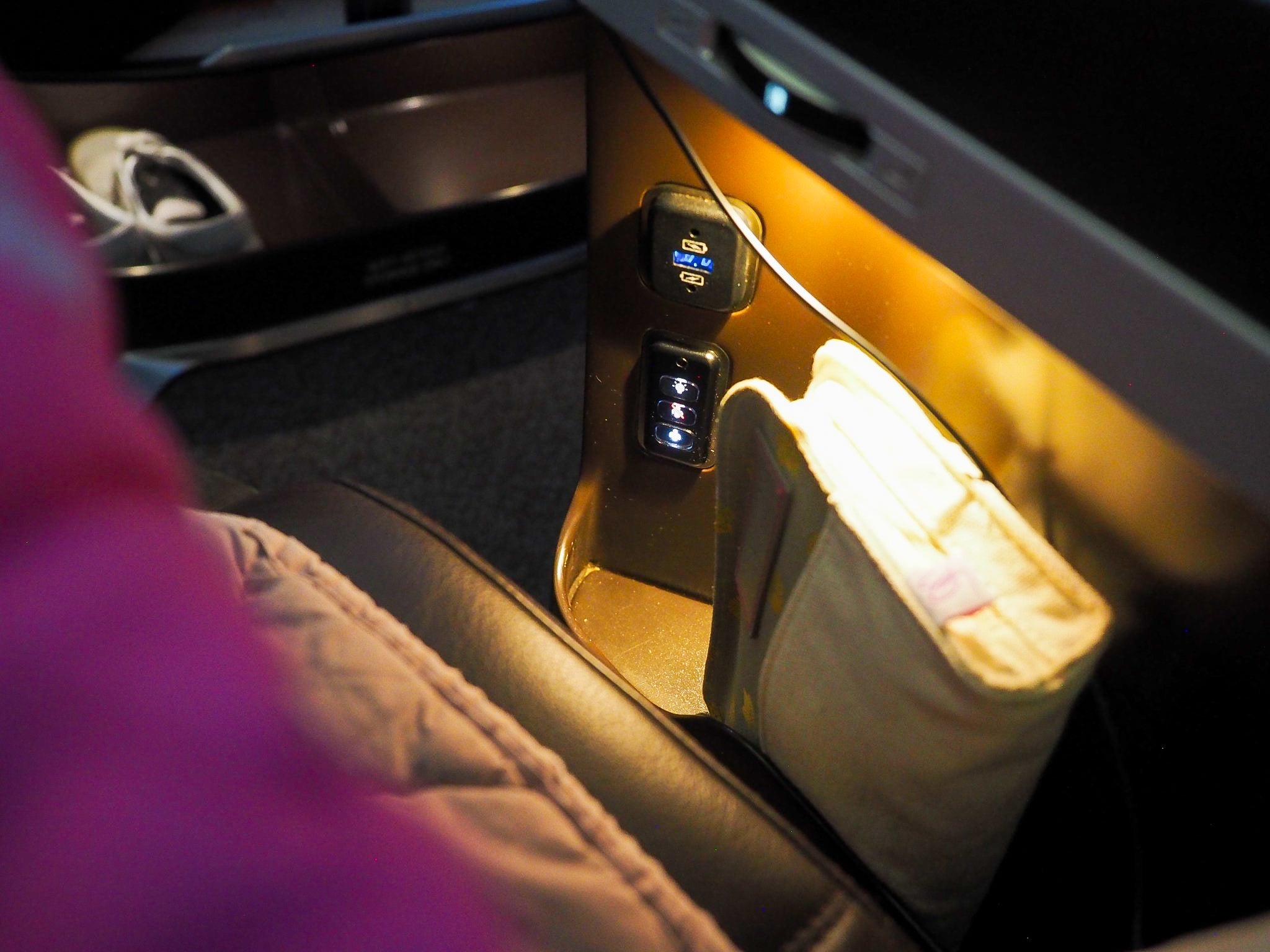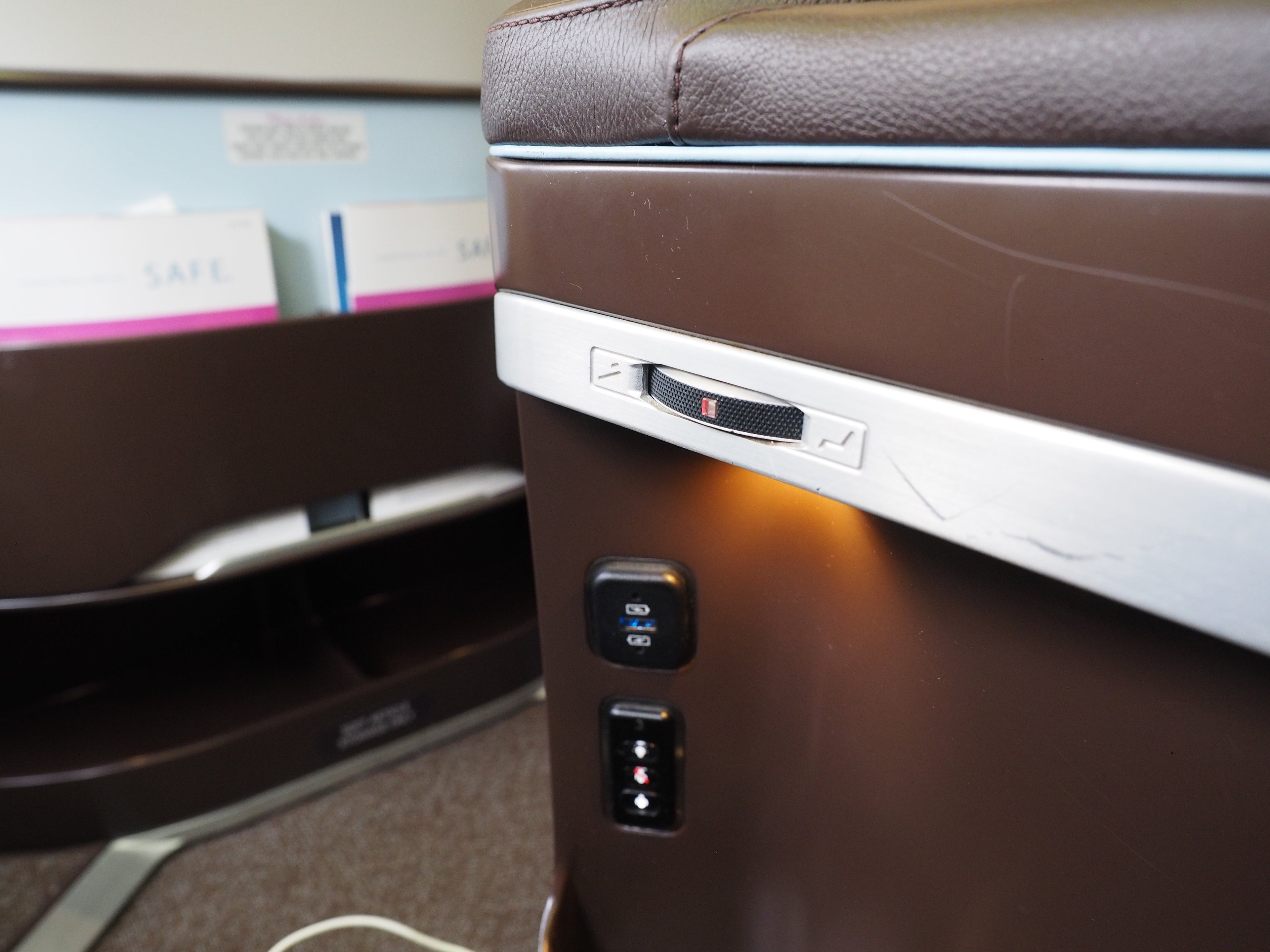 The seat, capable of 180-degree lie-flat, employed an intuitive (although somewhat limited) wheel to control its position. Below that was a USB charging port, a flight-attendant call button and reading-light switch. The other charging port was by my feet.