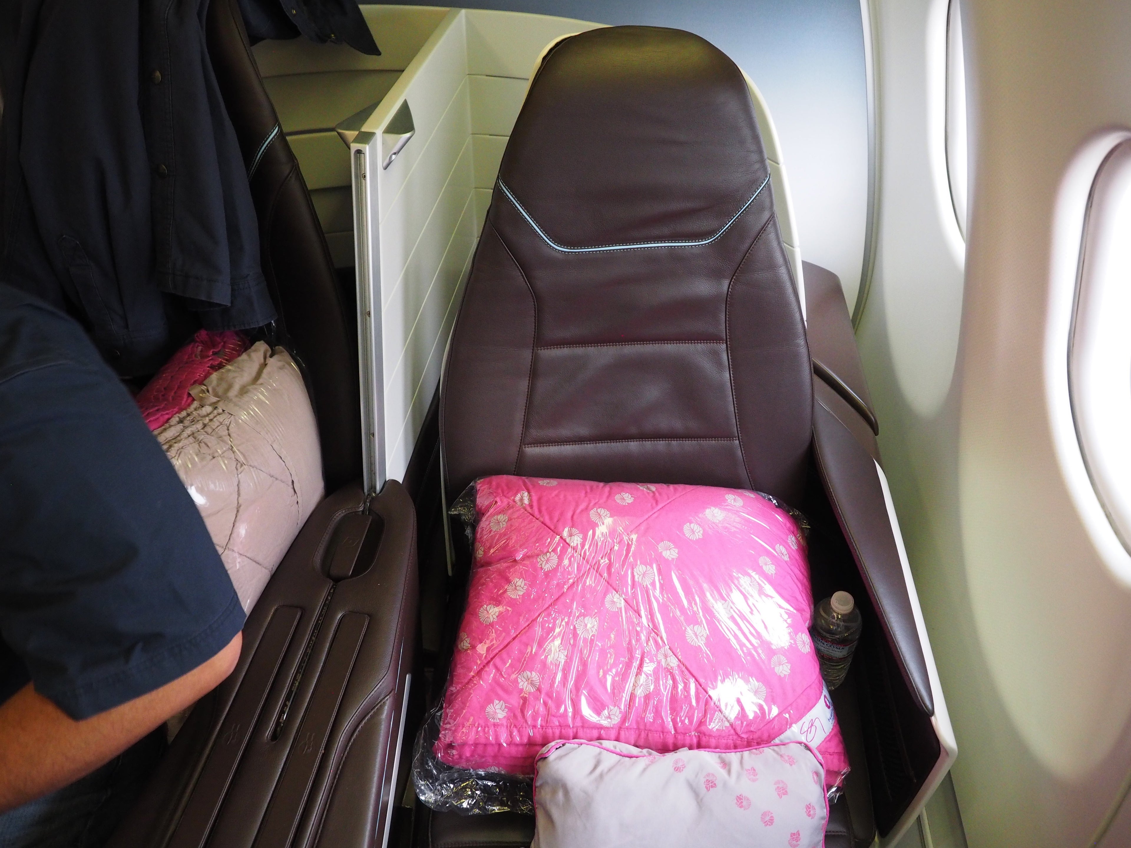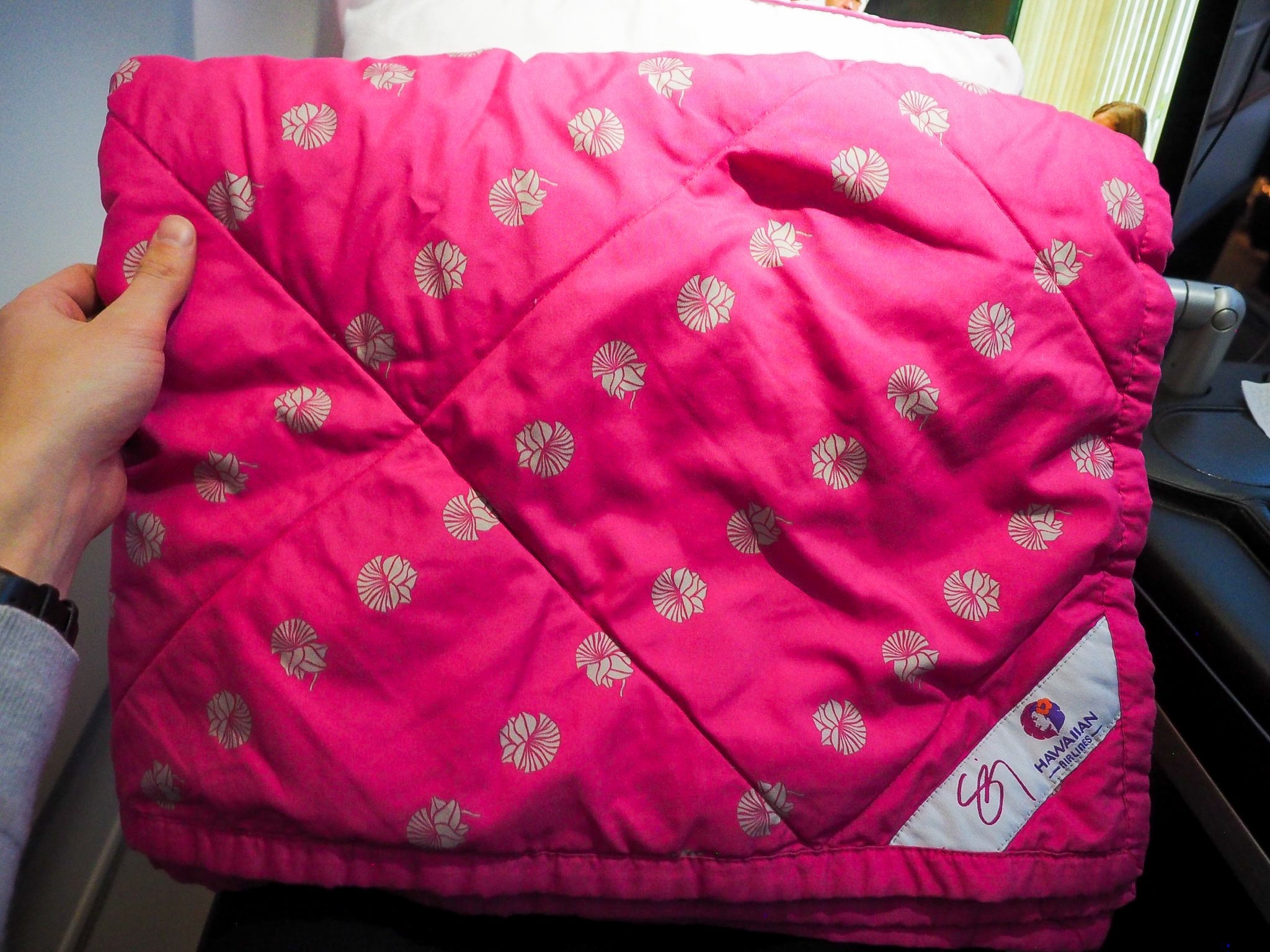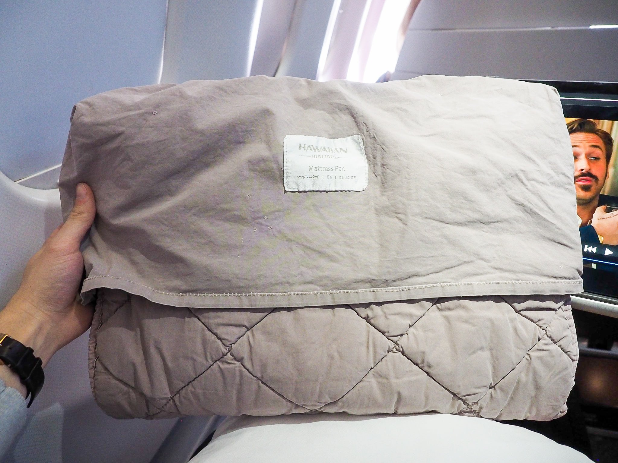 Upon boarding, each first-class seat was already stocked with goodies, including a plush, pink blanket, a mattress pad, a small — I'll call it a "day" — pillow and a larger one intended for sleeping. Not too shabby for a domestic flight, even a long one.