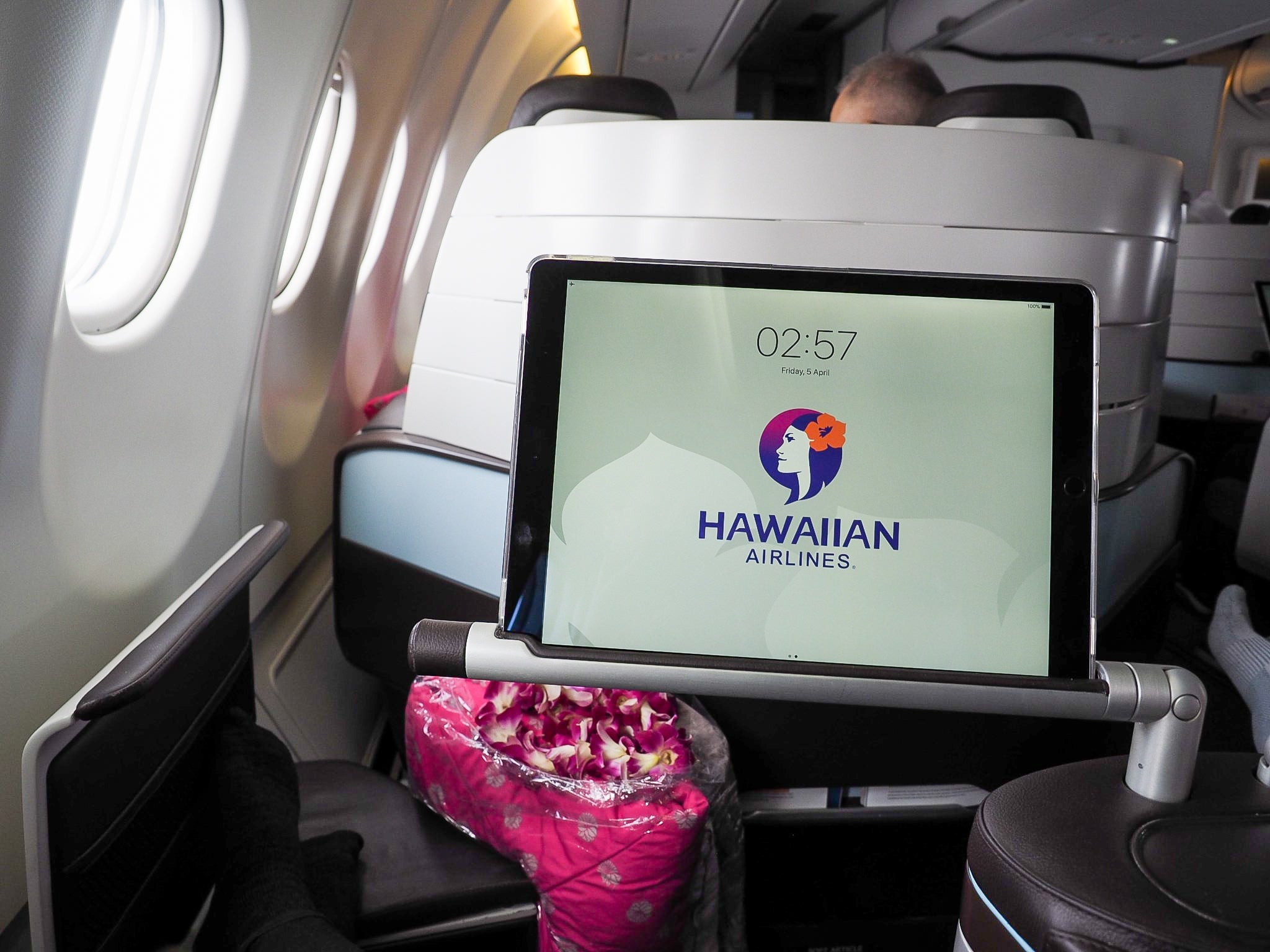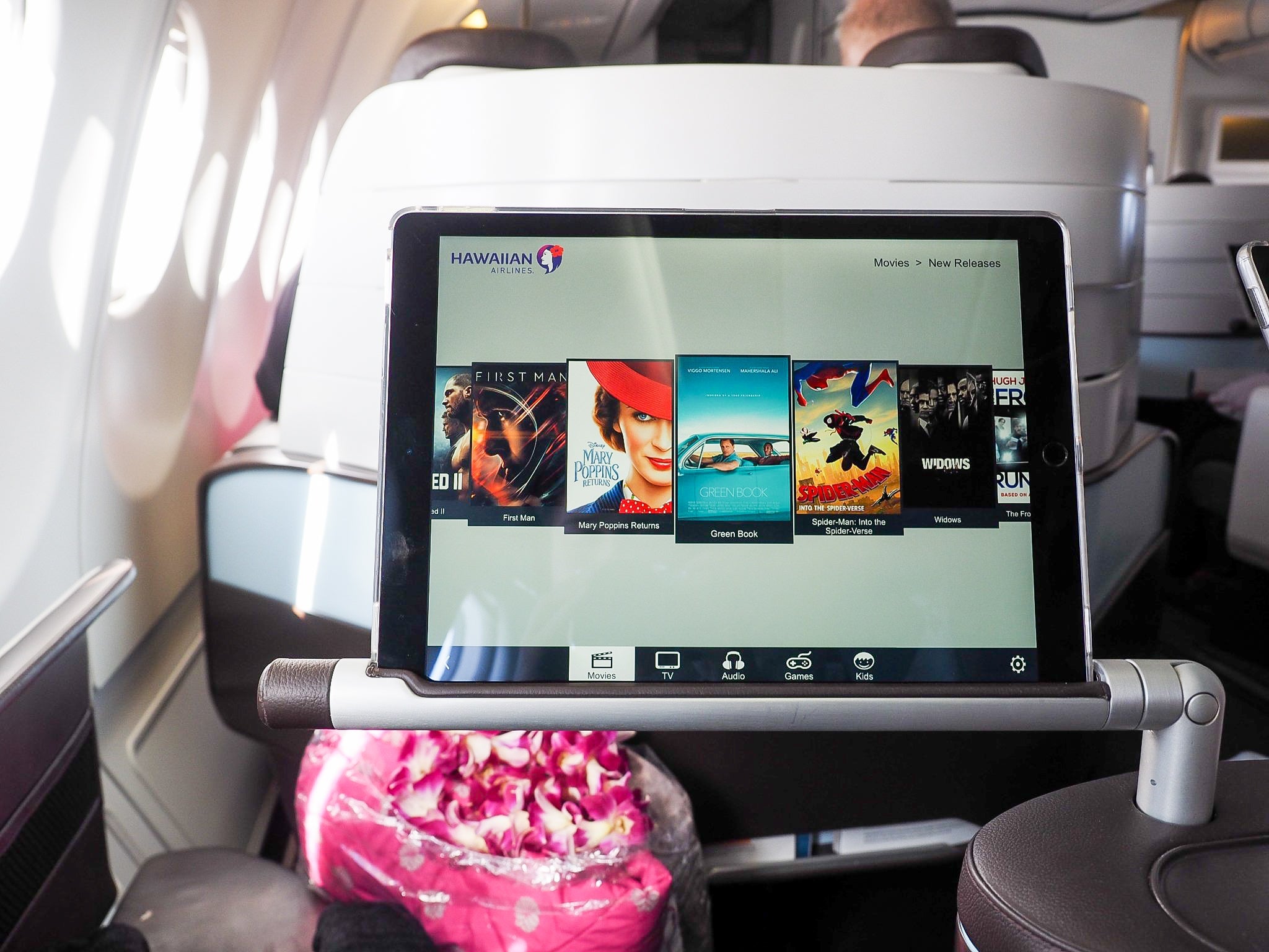 If you're thinking to yourself, "Where's the IFE screen?" the answer is that these seats don't actually have one. Instead, Hawaiian uses an expandable stand built into the seat, and passed out iPads loaded with content once we were airborne. It was a bit clunky (more on that later), but the actual stand used to hold it was effective and wasn't wobbly.