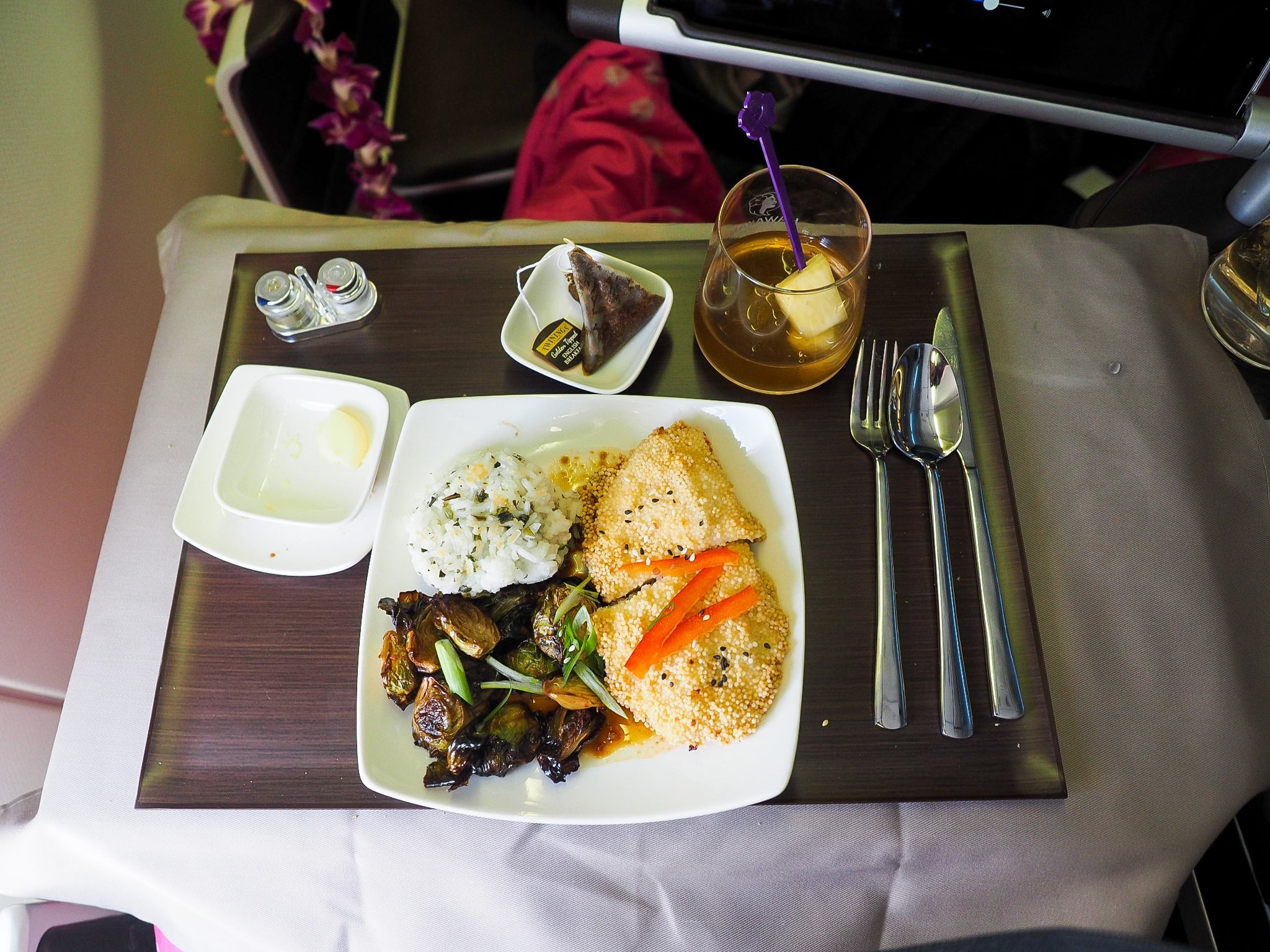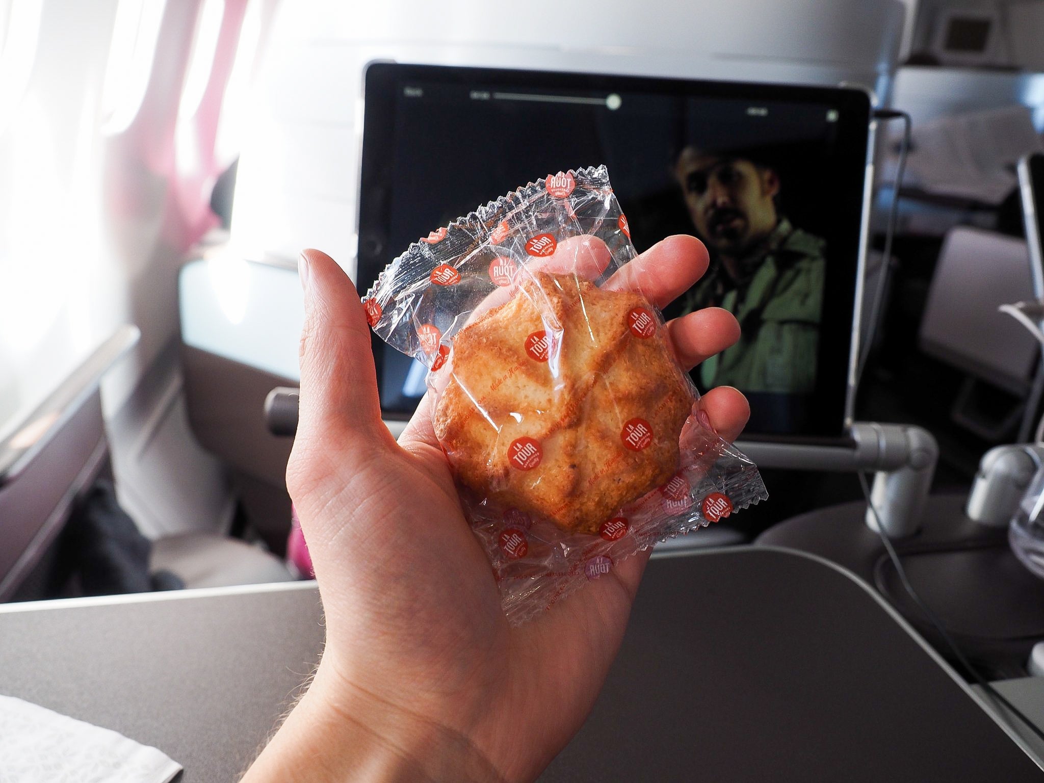 The chicken dish that came in place of the brisket actually proved to be the best food on the flight, served with rice and Brussels sprouts. The chicken breast was breaded in rice crackers and came with a honey-shoyu sauce. It wasn't until after arriving in Hawaii that I realized this was a more typical Hawaiian-style dish, but regardless it was excellent.