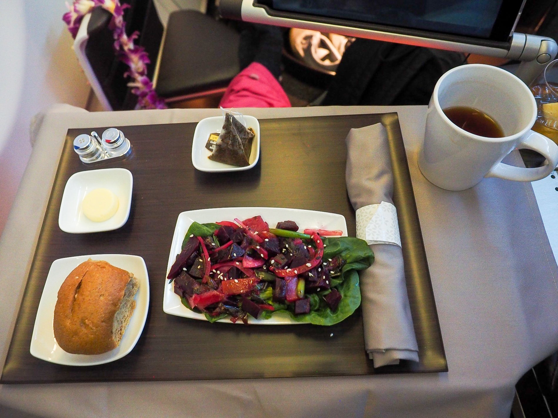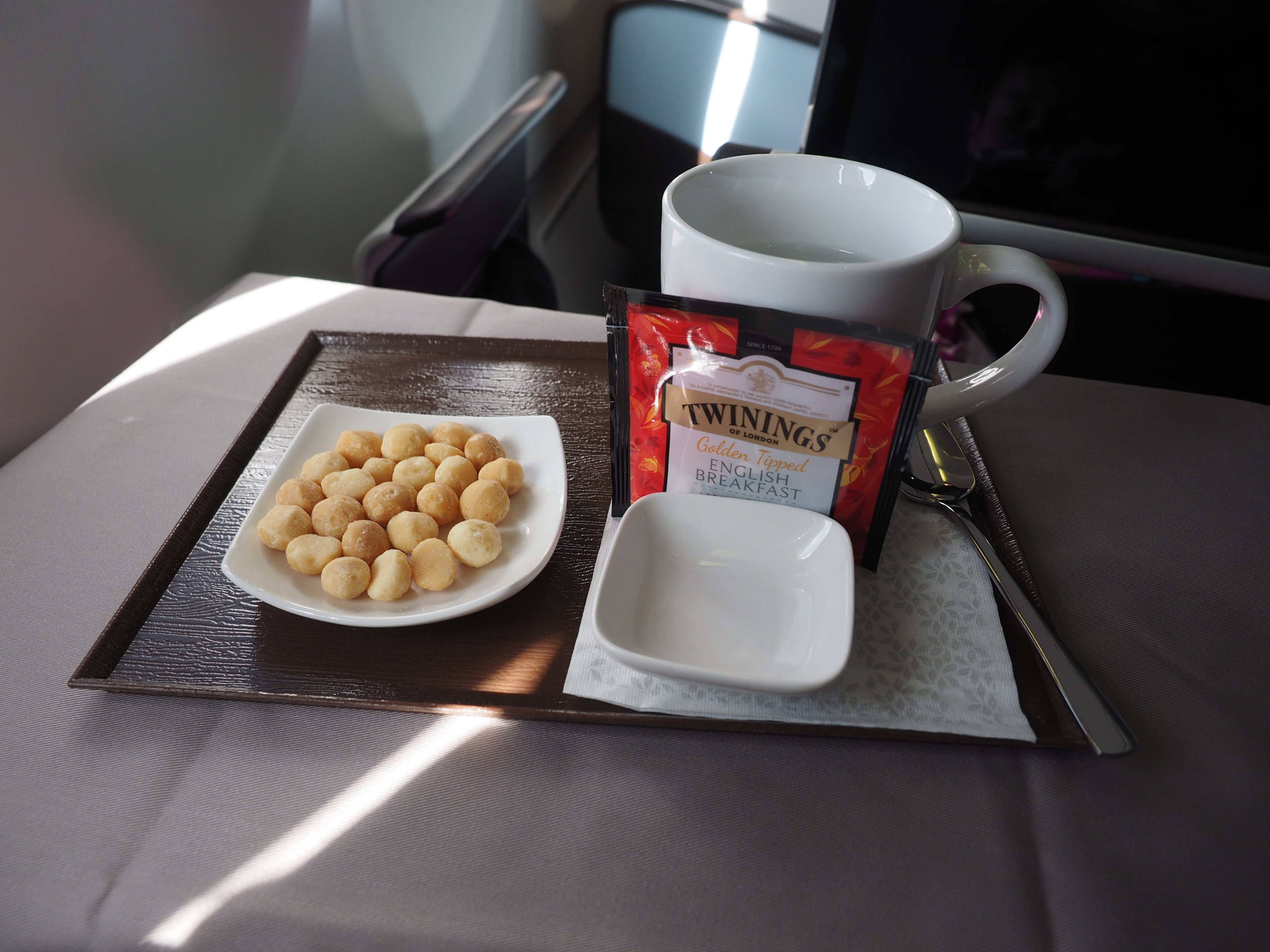 With about three and a half hours left in our flight, cabin crew came around again with tablecloths for the tray tables and a hot washcloth. I love a hot washcloth, especially after sleeping. I also got some more tea.
