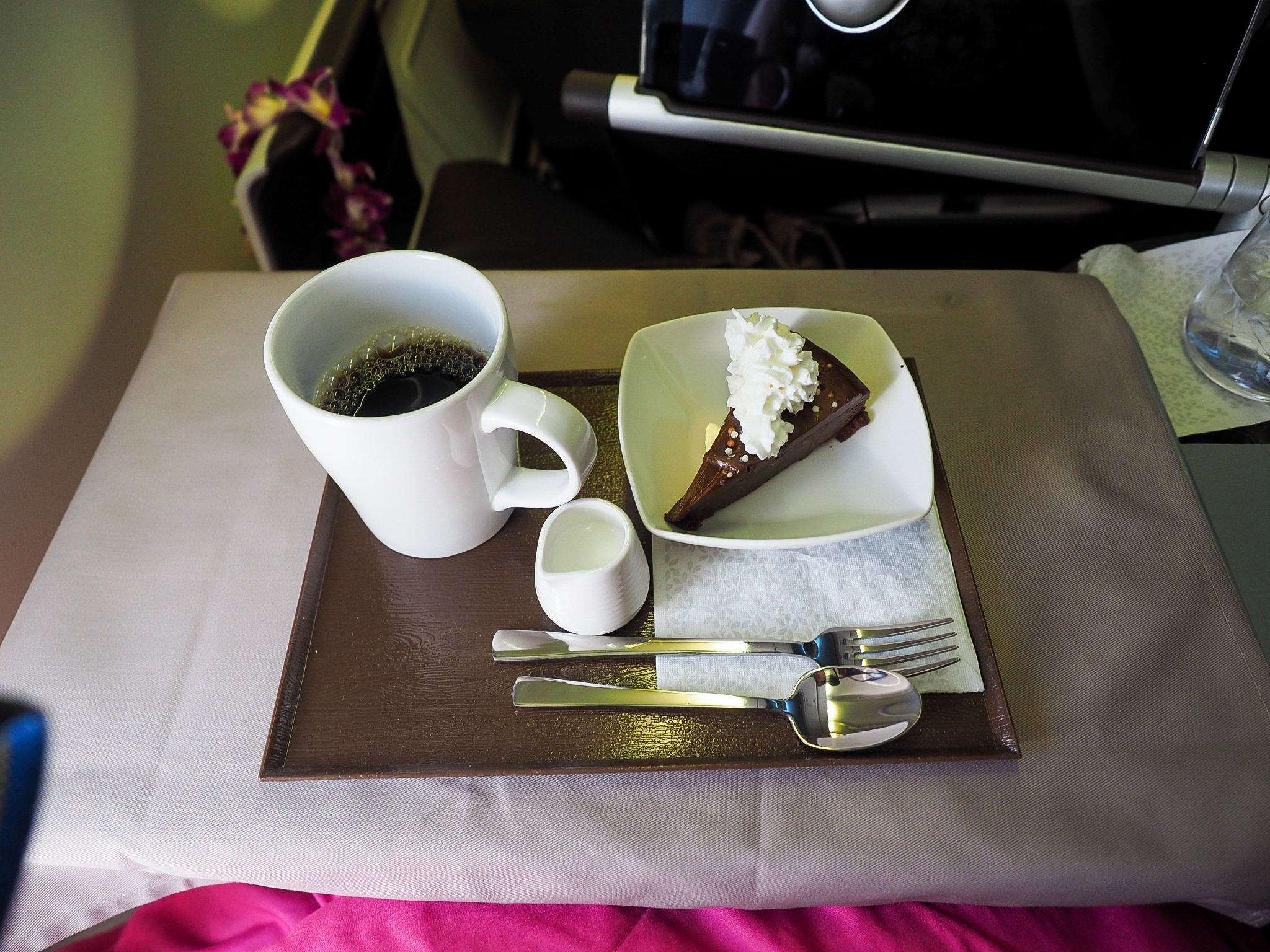 A little while after, the friendly flight attendant offered a chocolate cake with optional whipped cream, and coffee, tea or a dessert liquor.