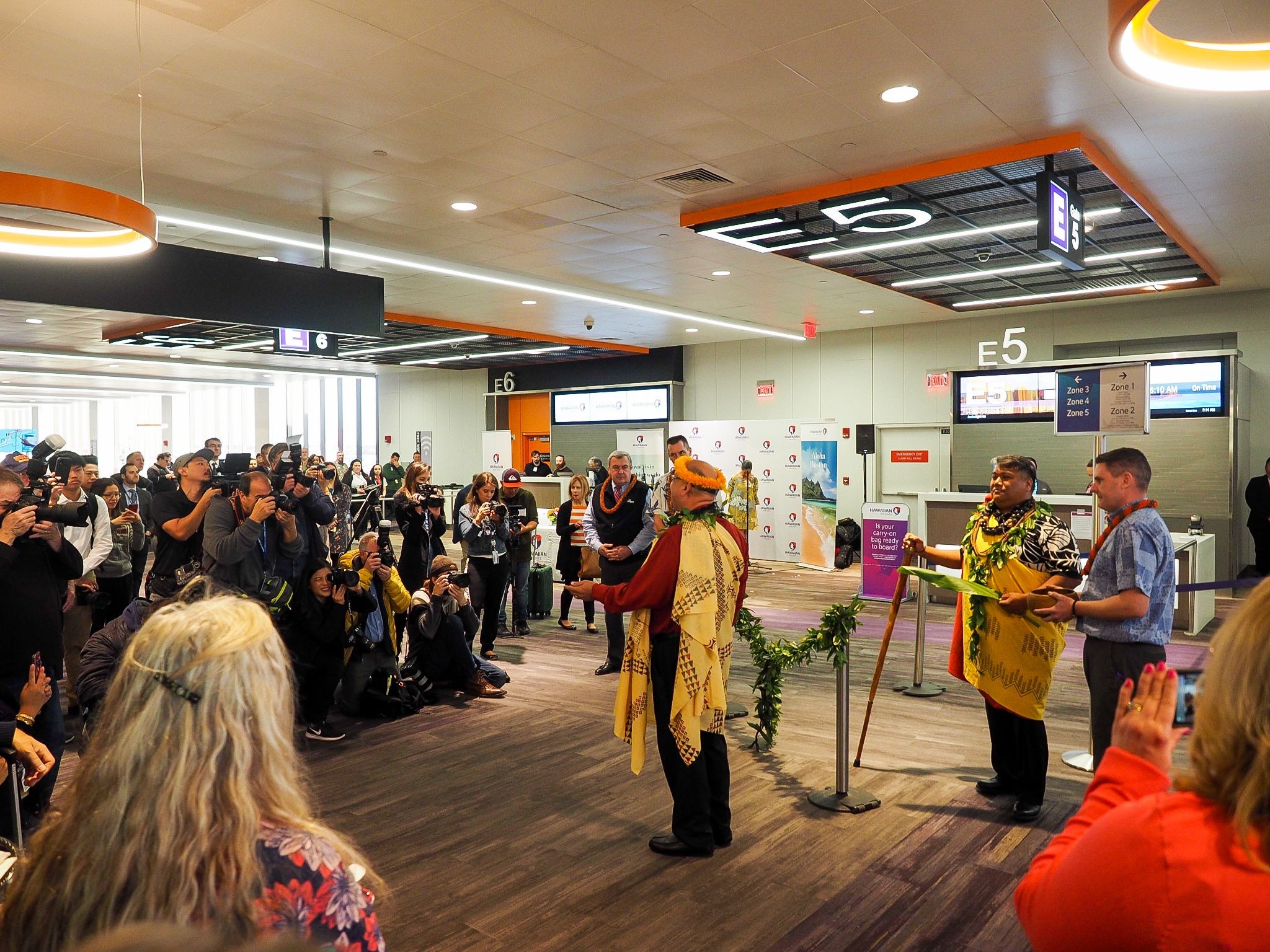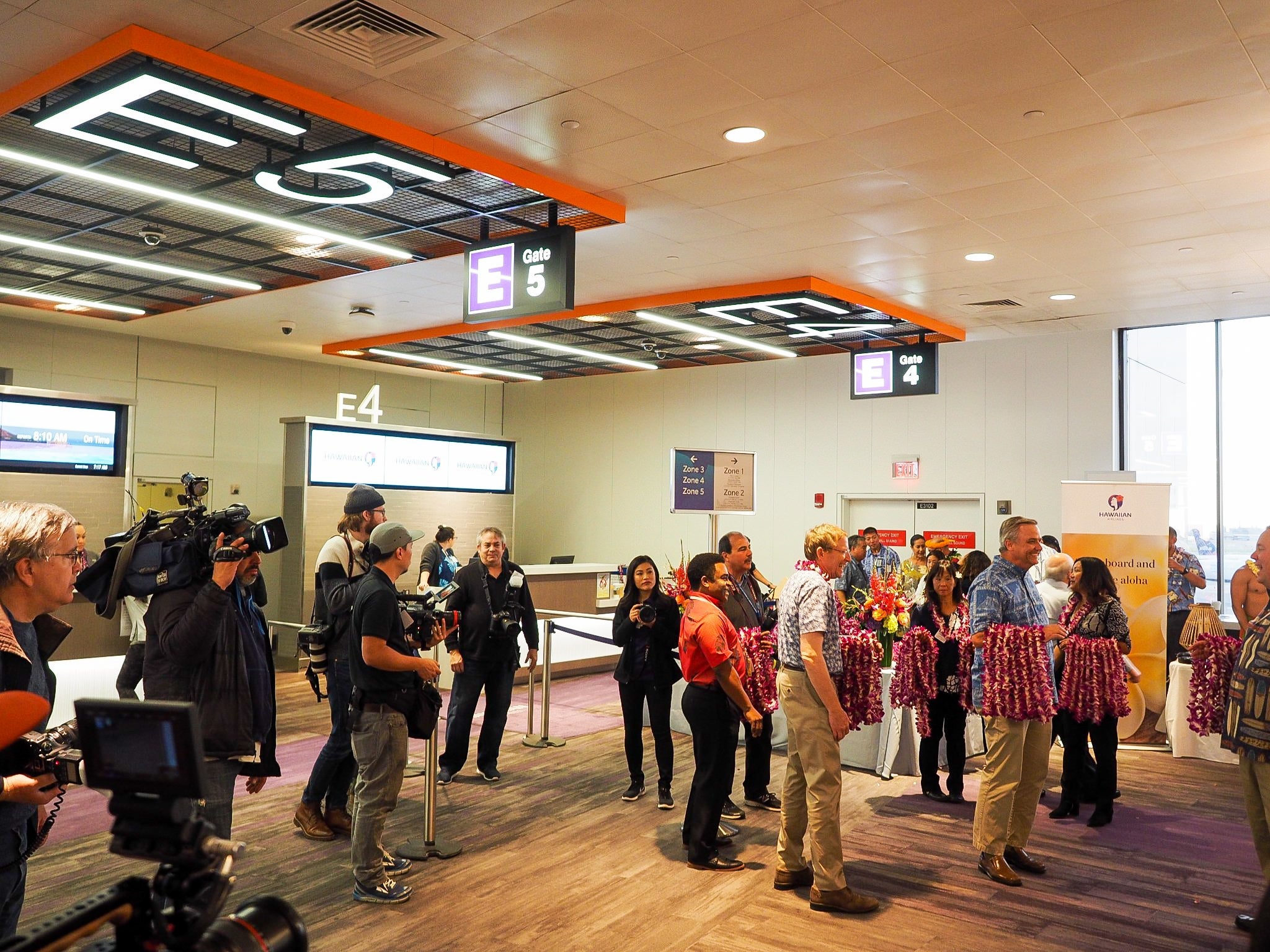 I hadn't been on an inaugural flight before, but it was a blast — by the time I arrived at the gate, festivities were in full swing. There were reporters with their cameras, an array of fresh fruit and coffee and even a brief Hawaiian ceremony to officially open the route.